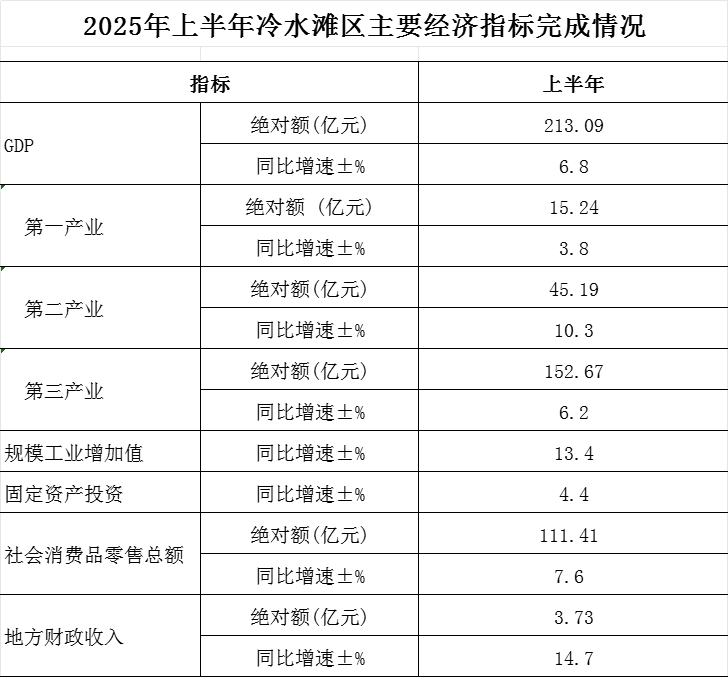 2025年上半年冷水滩区主要经济指标完成情况