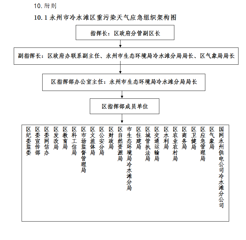 由冷水滩区重污染天气应急指挥部(以下简称指挥部)统一领导、组织、协调、指挥全区重污染天气应对工作。
