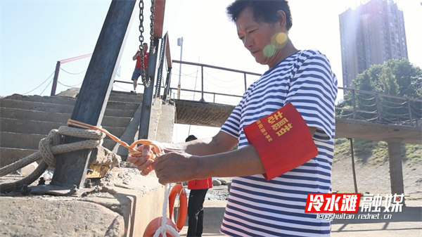上午八点,在湘江冷水滩浮桥段,工作人员正在加装新的防护警示牌,与此同时,防溺水志愿者、中国好人蒋德虎也开始了一天的日常巡逻工作。“我从早上八点出门,到晚上十点左右回家,每天出来看有没有小朋友私自下水,给他们劝导上去,再看下有没有救生设施损坏,尽我最大的努力保护好群众生命安全。”防溺水志愿者、中国好人蒋德虎如是说。