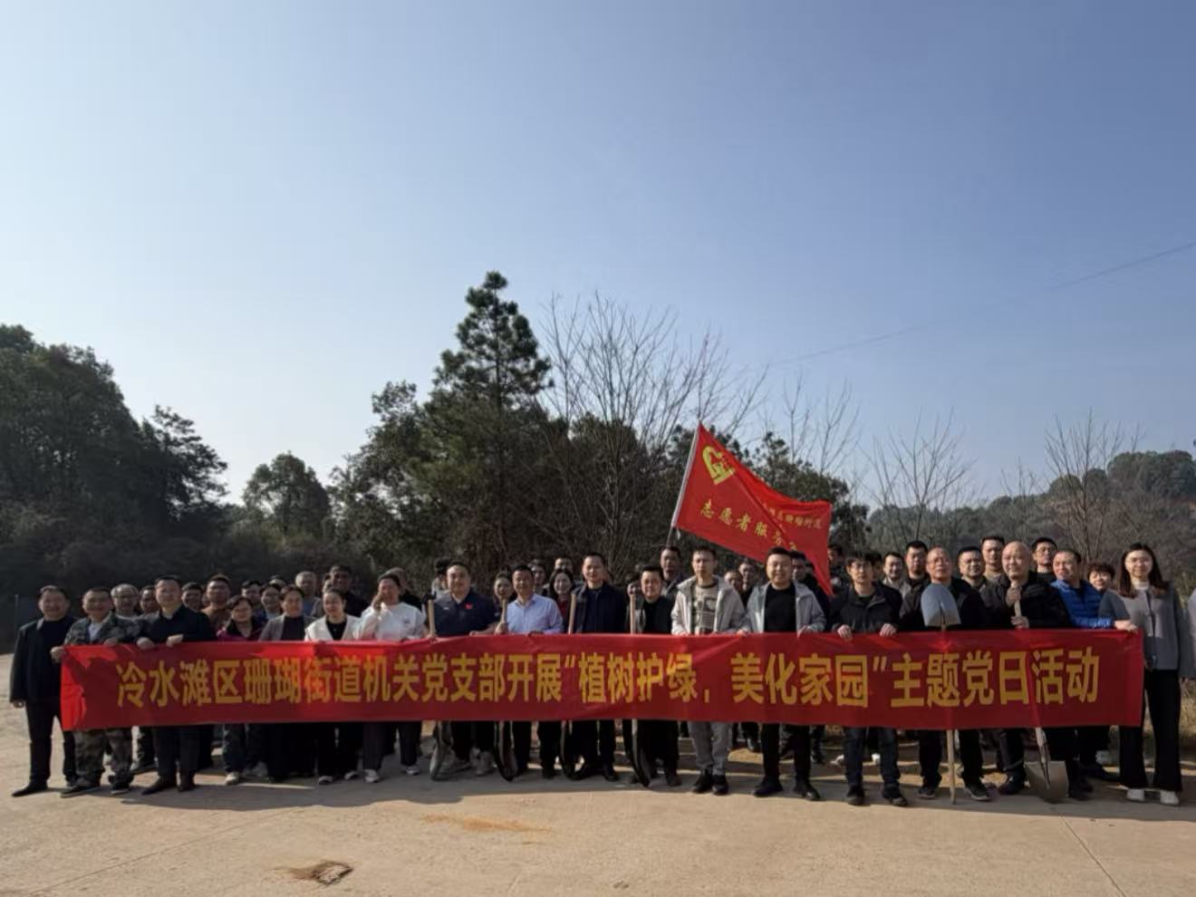 3月13日,冷水滩区珊瑚街道组织干部职工和群众在珍珠塘村开展义务植树活动。