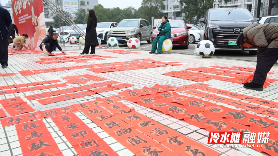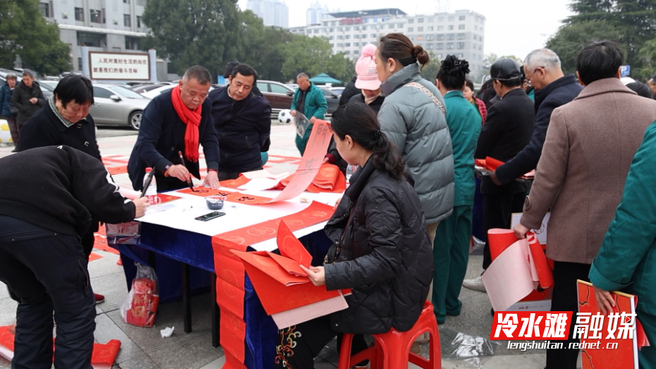 冷水滩融媒2月4日讯 (记者 陈彦希)2月4日上午,冷水滩区政府广场人头攒动、墨香四溢。区总工会联合区纪委监委、区文联等单位举办的2026年“送万福、进万家”书法公益系列活动拉开帷幕,为即将到来的新春佳节注入浓厚的文化气息与清廉风尚。