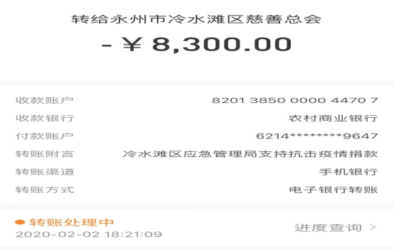 2月2日,冷水滩区应急管理局响应区慈善总会发起的“抗击新型冠状病毒感染肺炎疫情”募捐倡议活动,局工会迅速行动,号召动员全局干部职工积极参与,发扬“一方有难、八方支援”的优良传统,誓为打赢这场关系到人民生命健康的疫情防控阻击战尽应急人战“疫”绵薄之力。