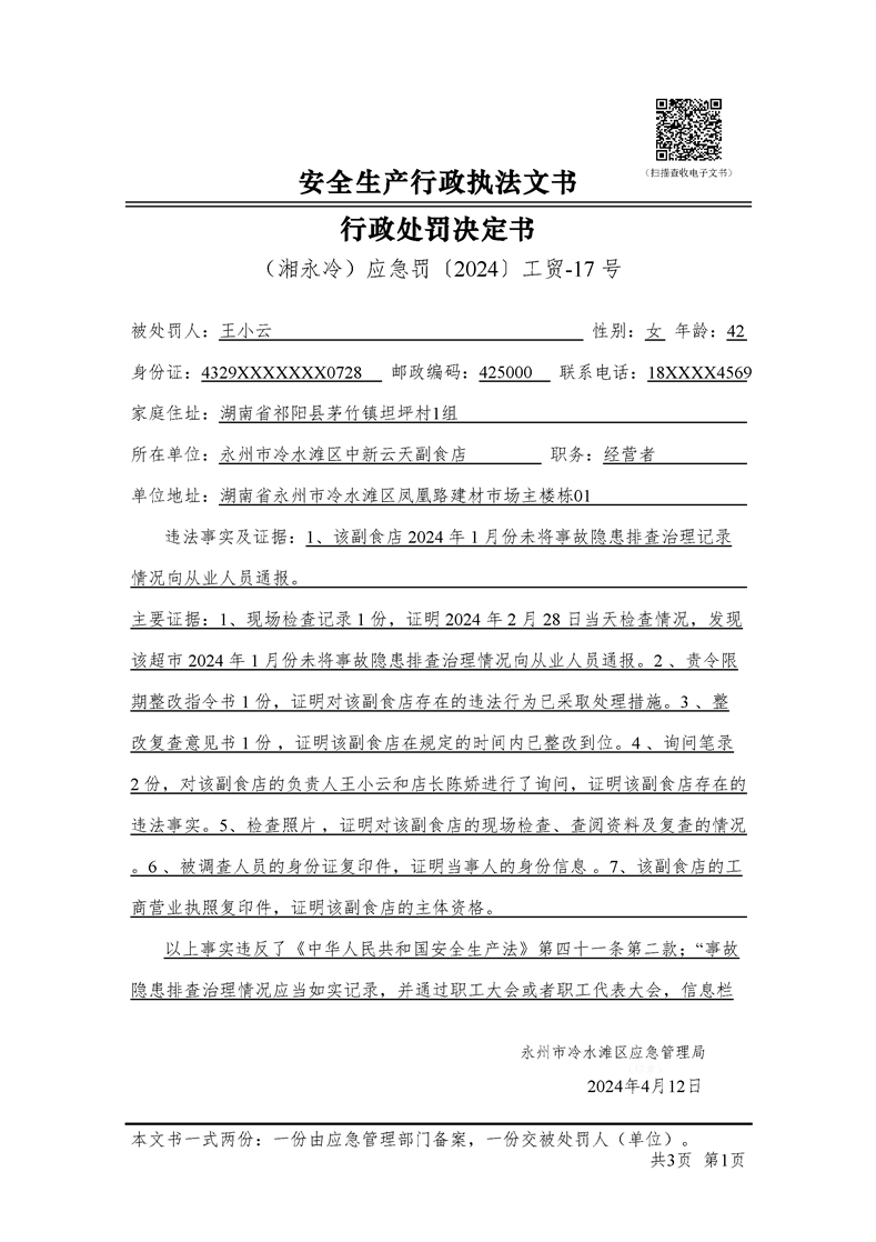 永州市冷水滩区中新云天副食店行政处罚决定书