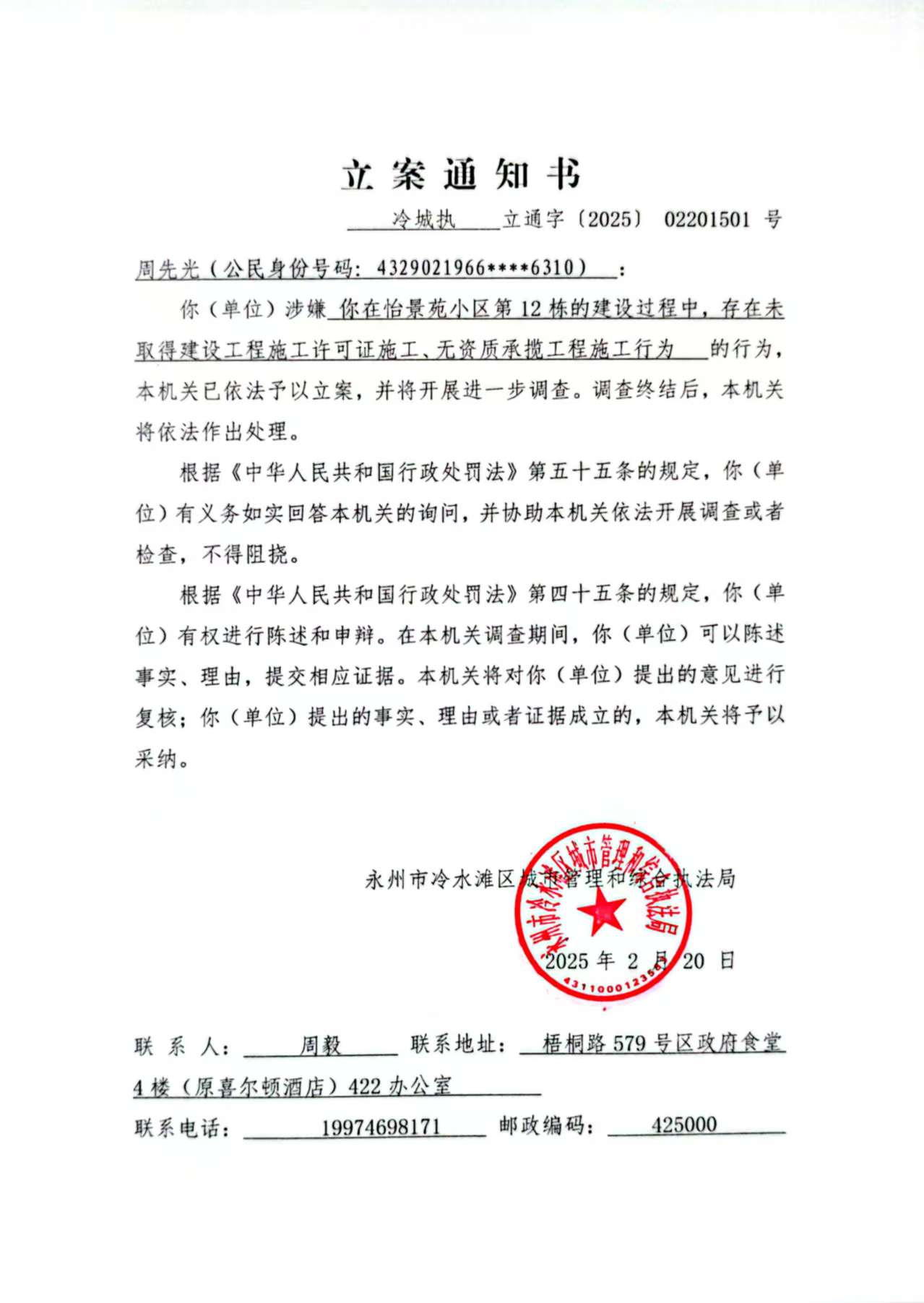 经查,永州市冷水滩区怡景苑小区第12栋房屋(J栋)项目建设过程中,你与秦冬林二人涉嫌存在未取得施工许可证擅自施工的违法行为,本机关于2025年2月20日作出《立案通知书》(冷城执调(询)通字〔2025〕02201501号)。由于无法联系你本人,并且采用其他方式均无法送达,现依据《住房和城乡建设行政处罚程序规定》第三十五条第一款及第三十六条第二款、《中华人民共和国民事诉讼法》第九十五条的规定,向你公告送达《立案通知书(冷城执调(询)通字〔2025〕02201501号),请你自公告发出之日起三十日内到我局领取上述文书正本,逾期即视为送达。(通知书内容如下)
