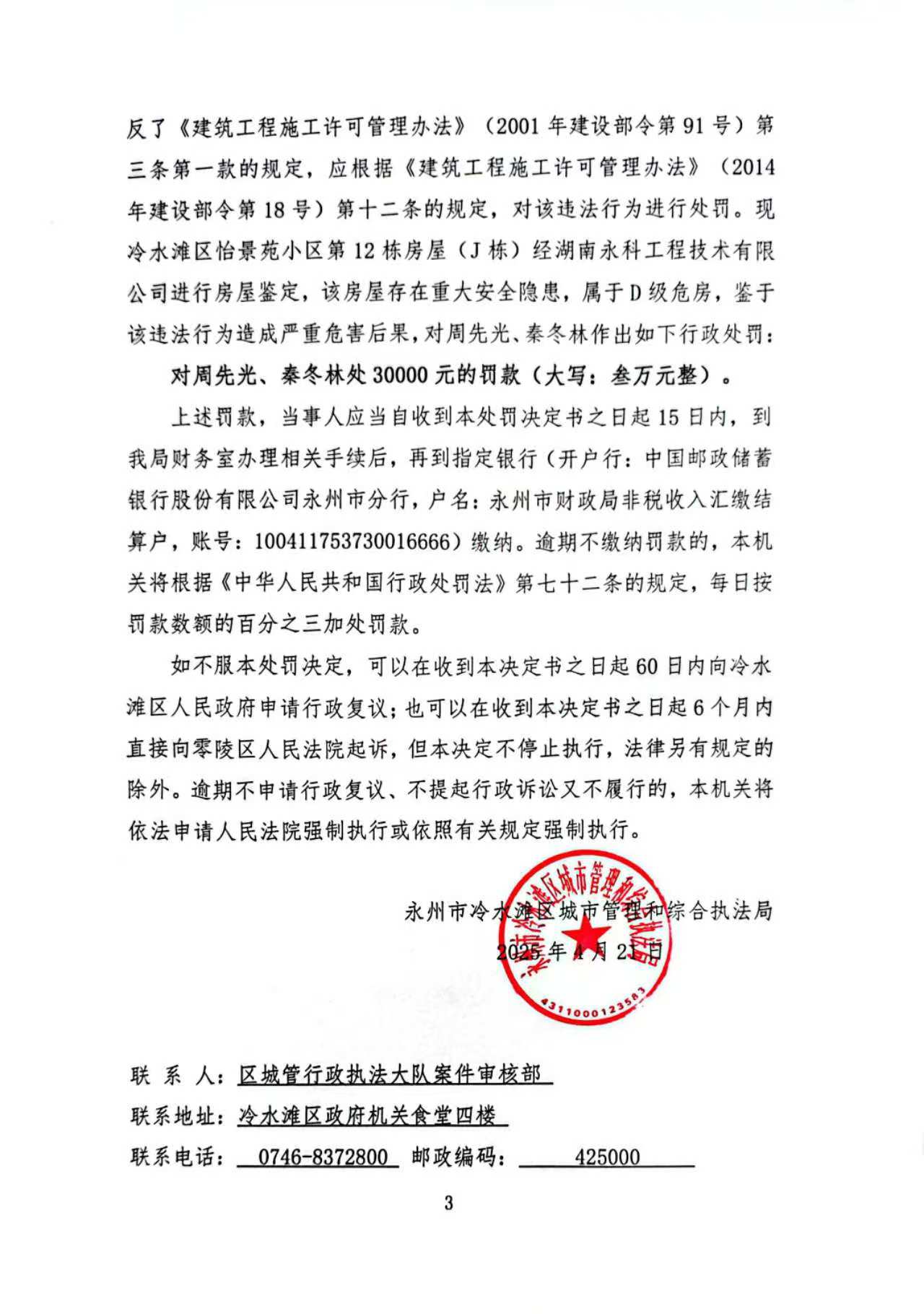 永州市冷水滩区城市管理和综合执法局《行政处罚决定书》(冷城罚决字〔2025〕4号)送达公告
