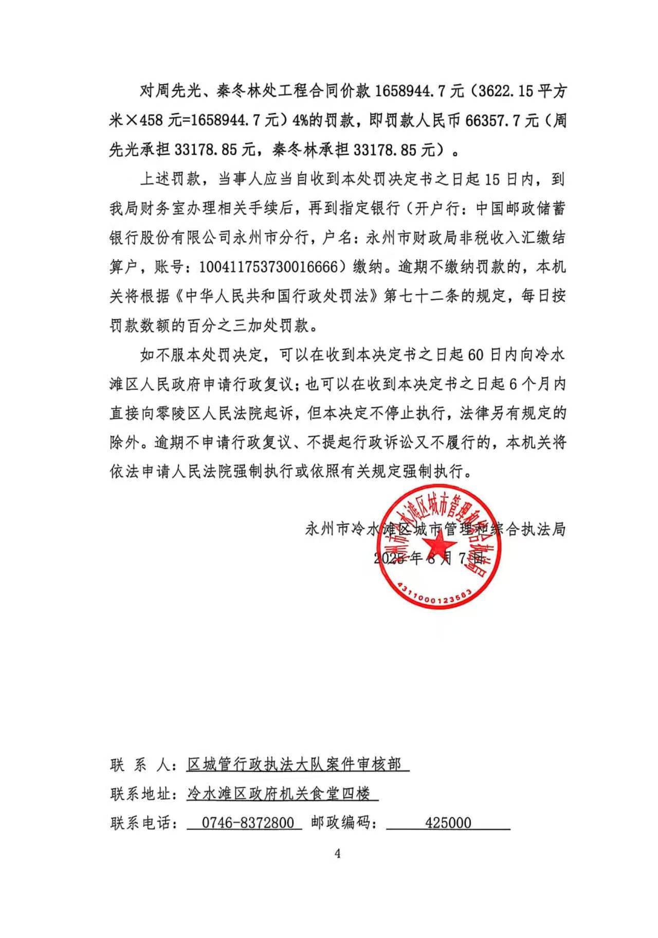 永州市冷水滩区城市管理和综合执法局《行政处罚决定书》(冷城罚决字〔2025〕15号)送达公告