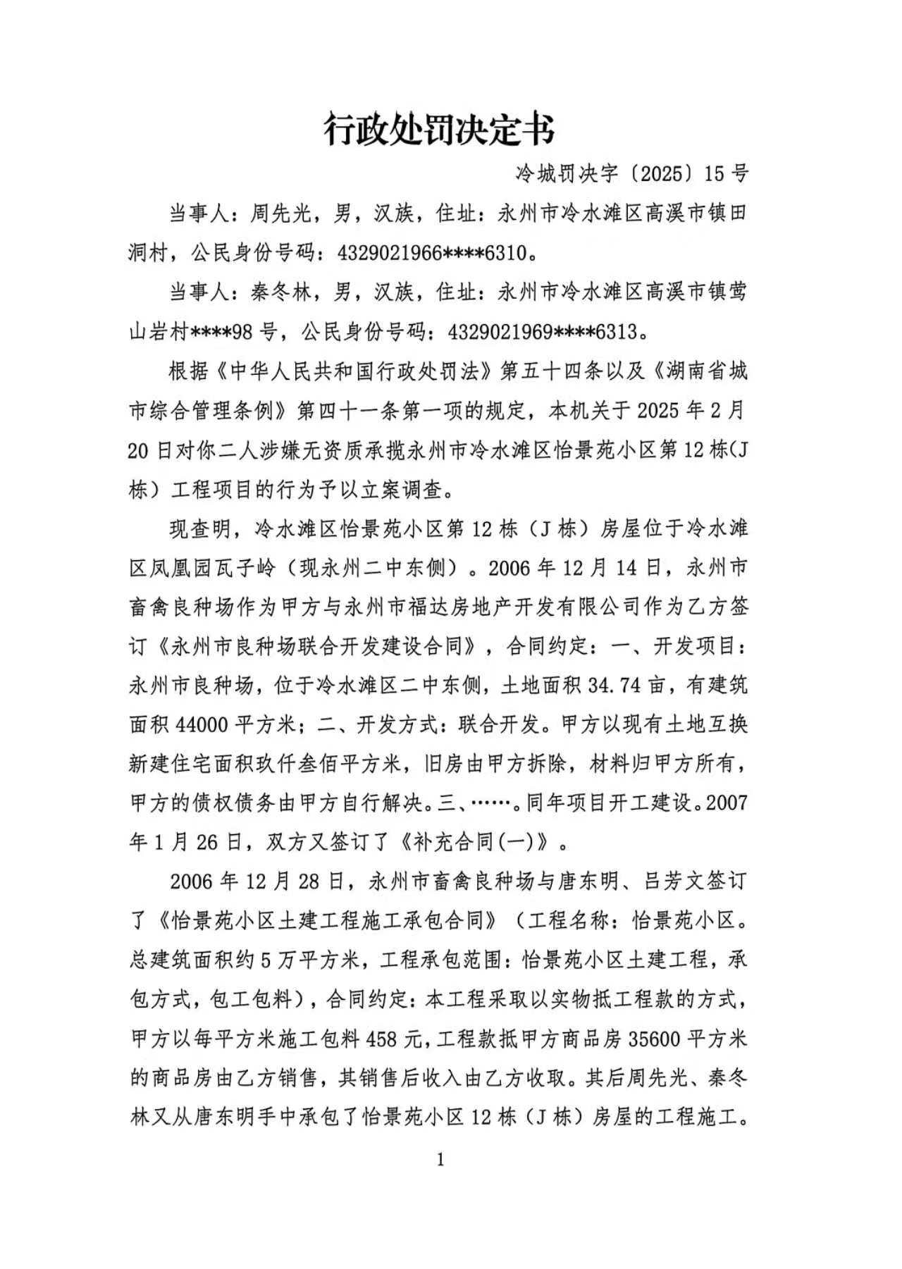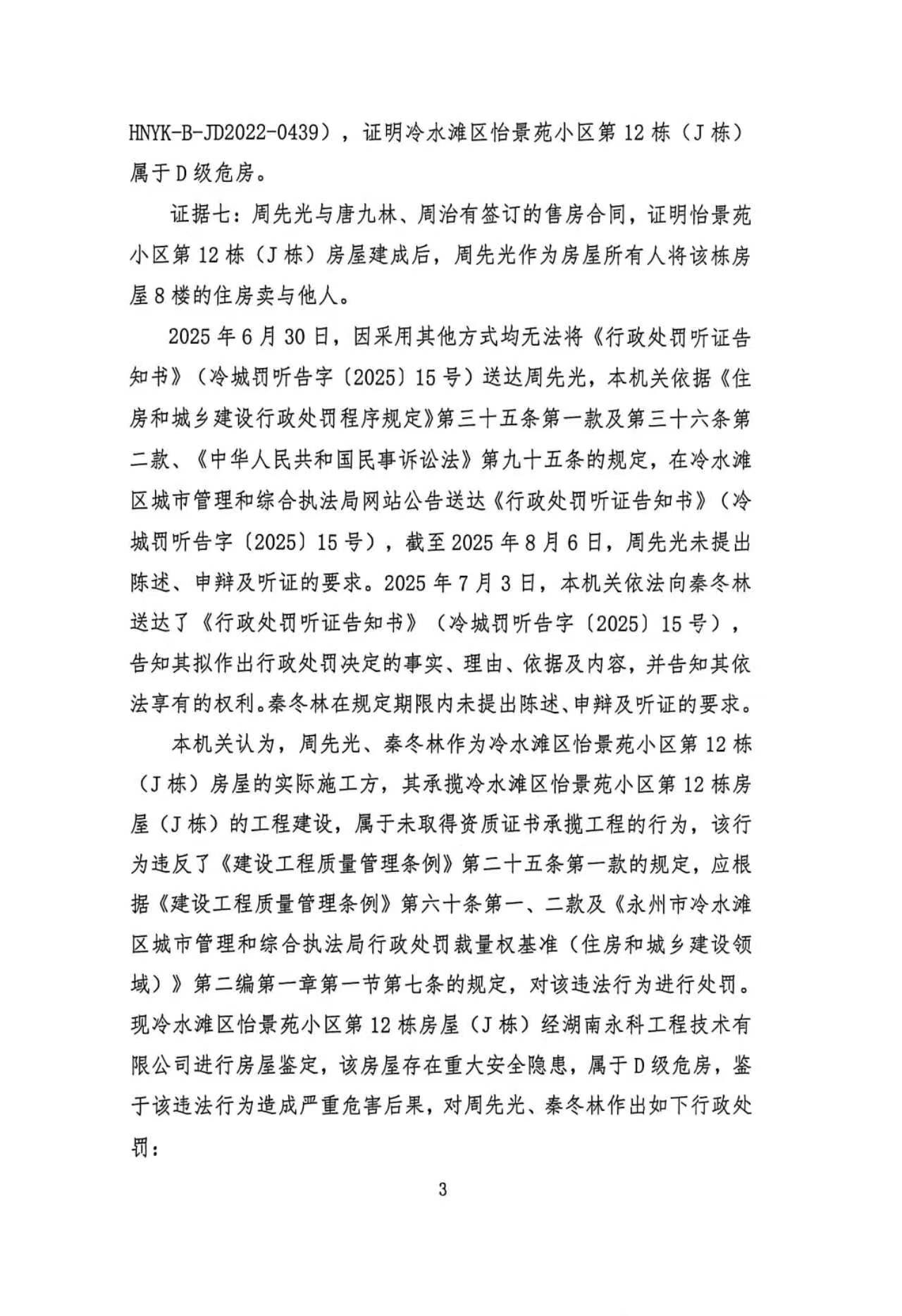 经查,永州市冷水滩区怡景苑小区第12栋房屋(J栋)项目建设过程中,你与秦冬林二人存在未取得施工许可证擅自施工的违法行为,本机关于2025年8月7日作出《行政处罚决定书》(冷城罚决字〔2025〕15号)。由于采用其他方式均无法送达,现依据《住房和城乡建设行政处罚程序规定》第三十五条第一款及第三十六条第二款、《中华人民共和国民事诉讼法》第九十五条的规定,向你公告送达《行政处罚决定书》(冷城罚决字〔2025〕15号),请你自公告发出之日起三十日内到我局领取上述文书正本,逾期即视为送达。(决定书内容如下)