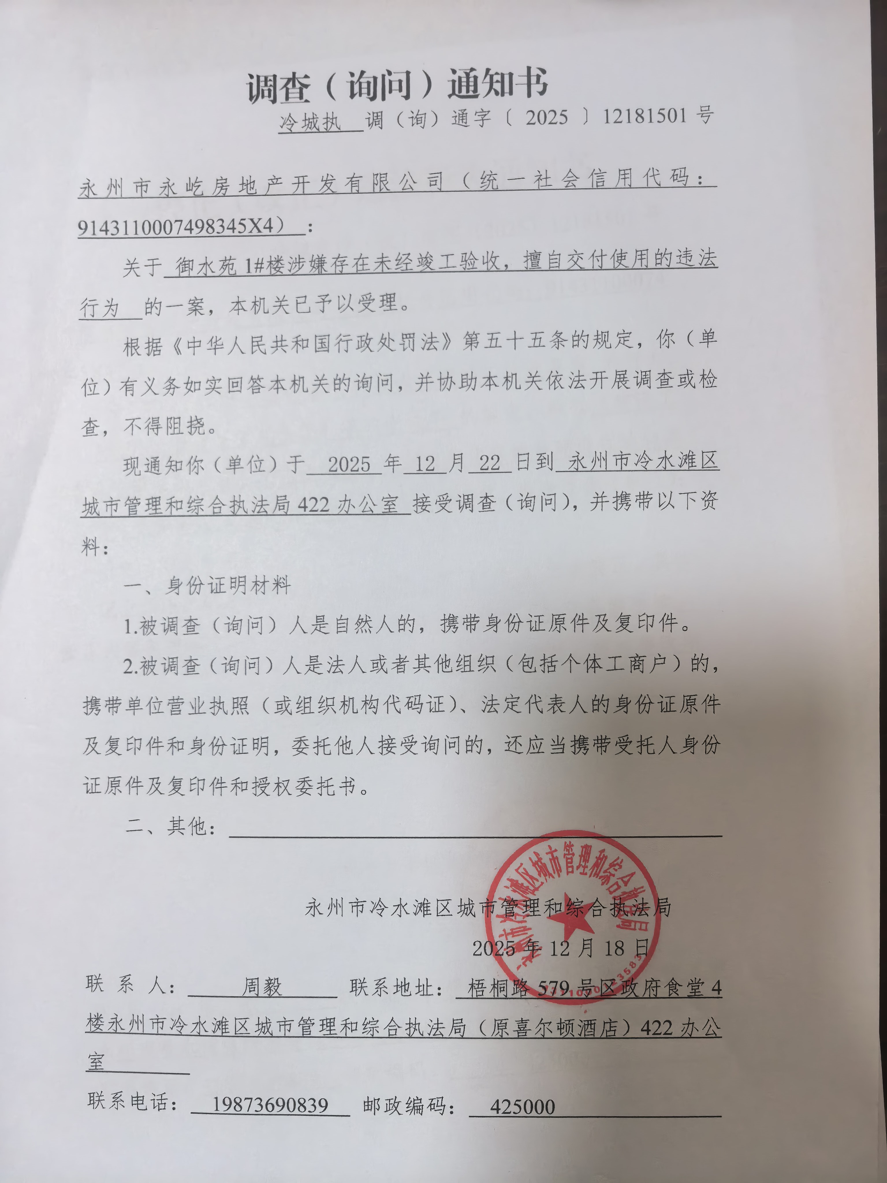 永州市冷水滩区城市管理和综合执法局《调查(询问)通知书》冷城执调(询)通字〔2025〕12181501号