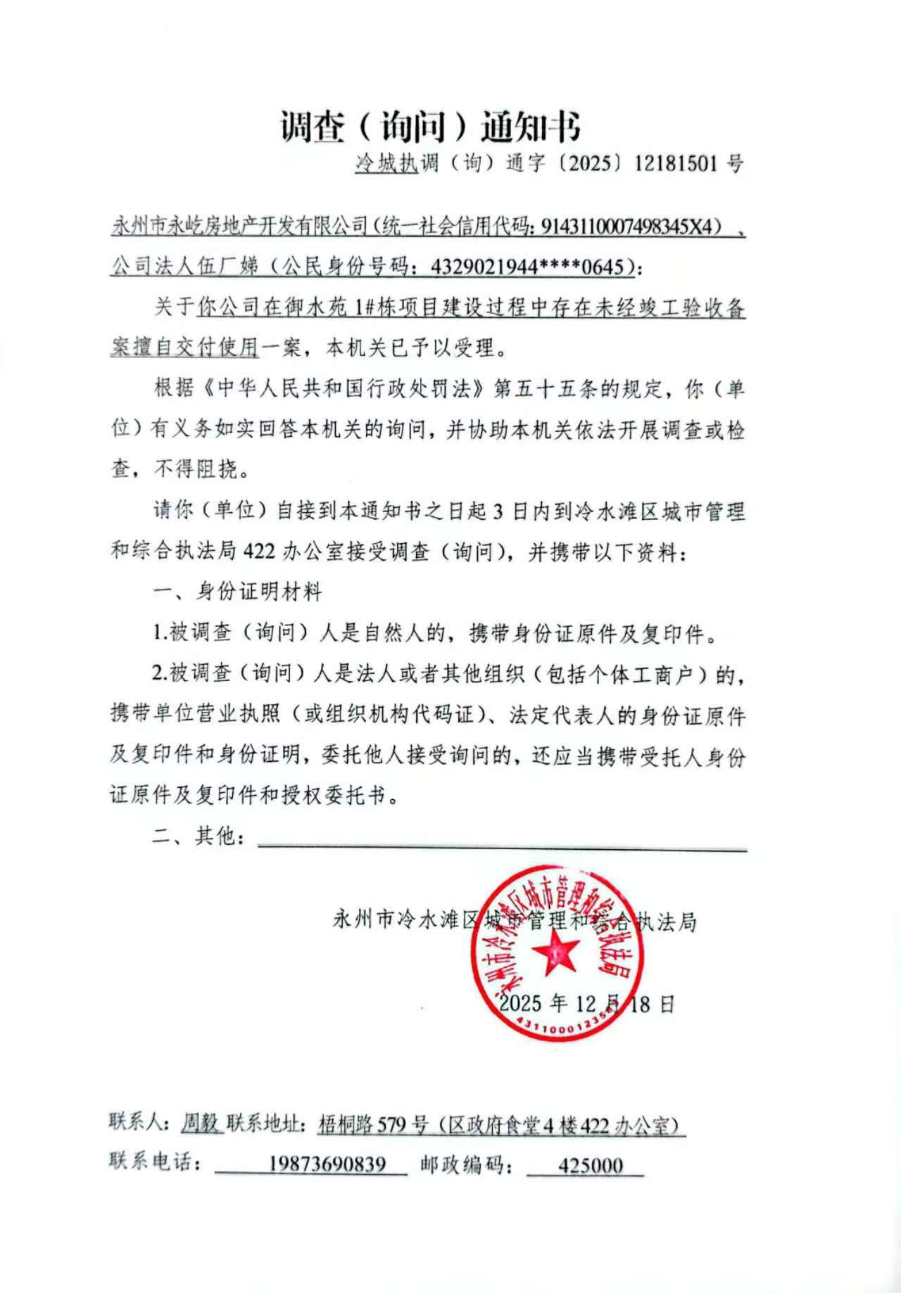 经查,永州市永屹房地产开发有限公司开发建设的永州市御水苑1#楼工程存在未办理竣工验收备案的违法行为,本机关于2025年12月18日作出《调查(询问)通知书》(冷城执调〔询〕通字〔2025〕12181501号)。由于采用其他方式均无法送达,现依据《中华人民共和国民事诉讼法》第九十五条的规定,向你公司公告送达《调查(询问)通知书》(冷城执调〔询〕通字〔2025〕12181501号),请你公司自公告发出之日起三十日内到我局领取上述文书正本,逾期即视为送达。(具体内容如下)