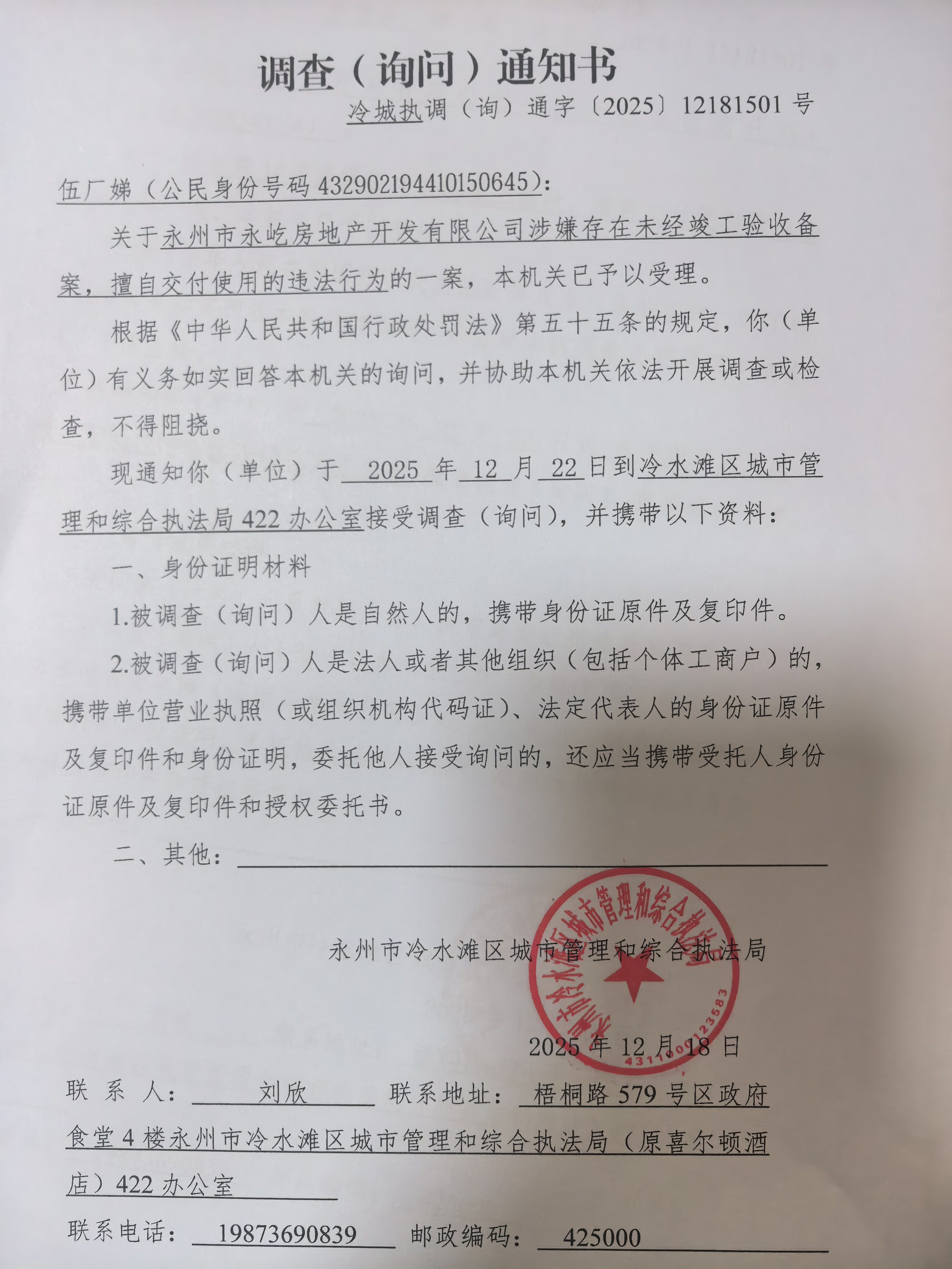 永州市冷水滩区城市管理和综合执法局《调查(询问)通知书》冷城执调(询)通字〔2025〕12181501号