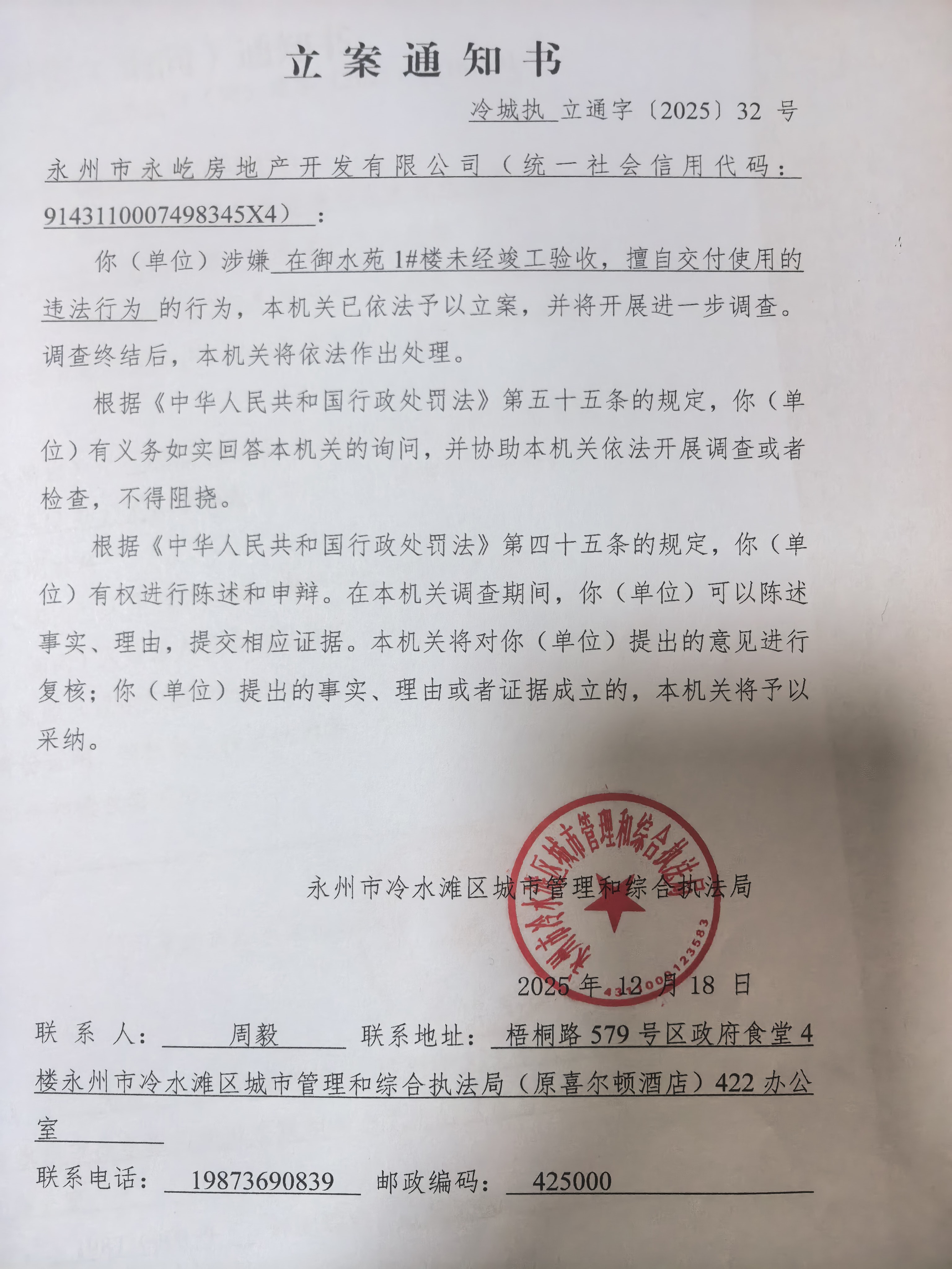 永州市冷水滩区城市管理和综合执法局《立案通知书》冷城执立通字(2025)32号