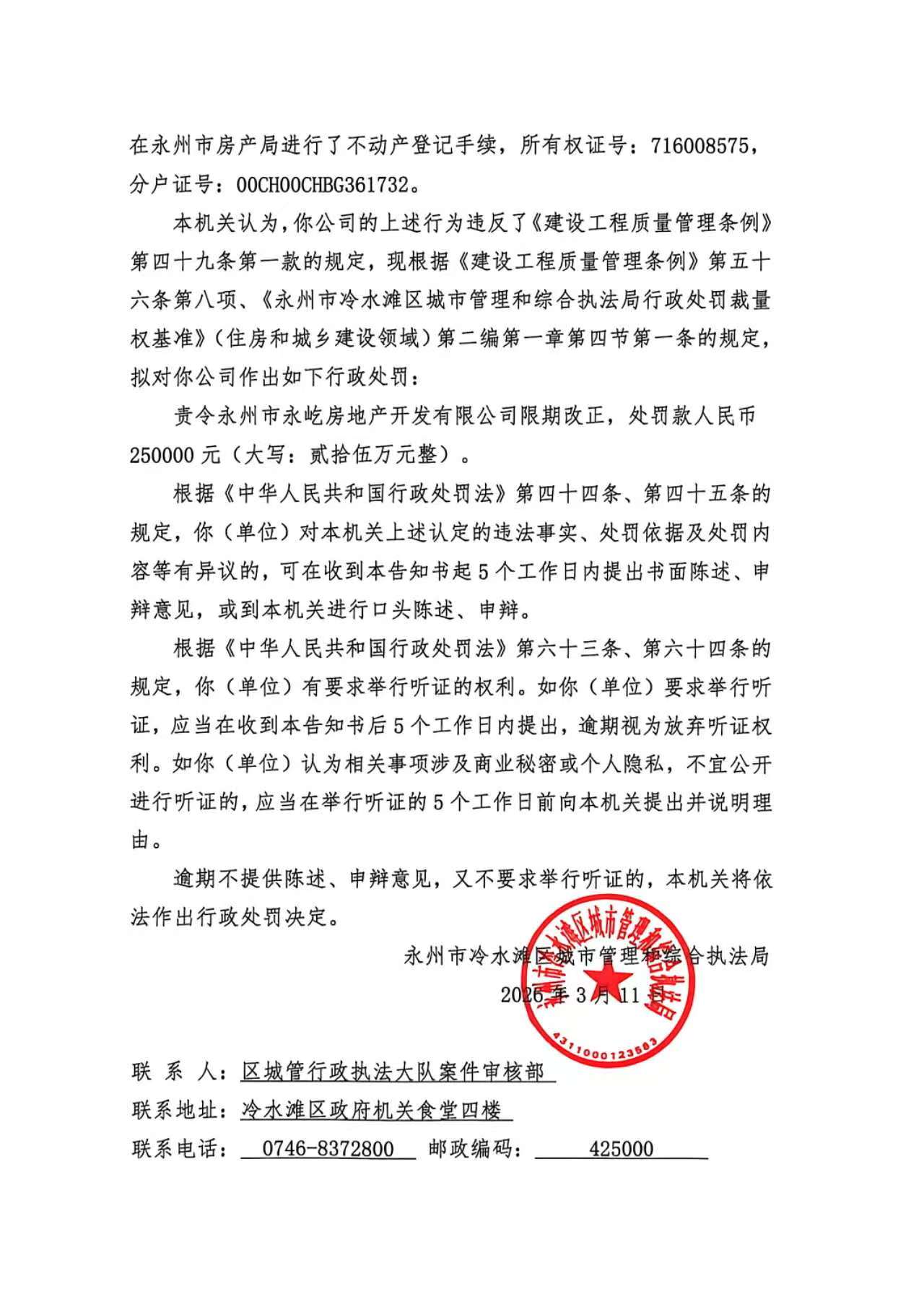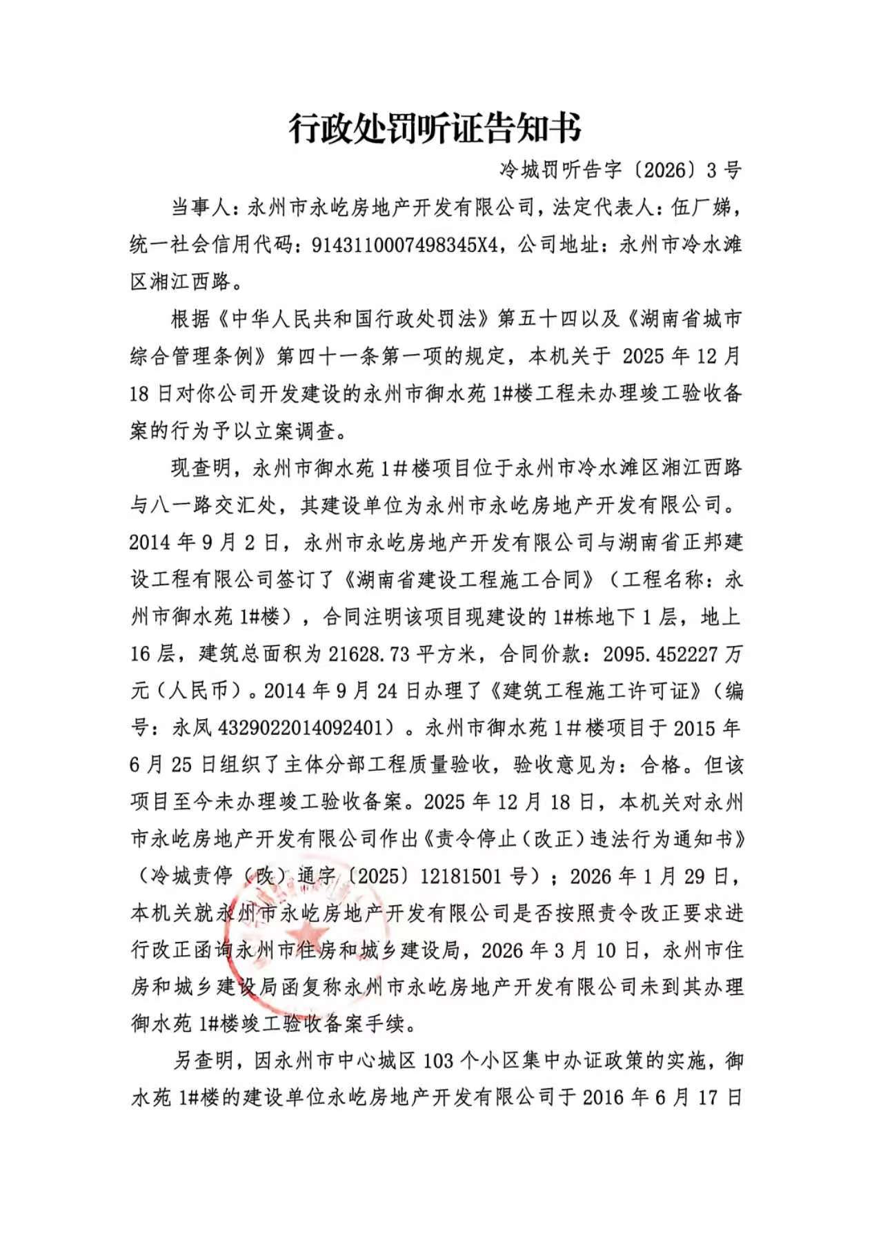 经查,你公司开发建设的永州市御水苑1#楼工程涉嫌存在未办理竣工验收备案的违法行为,本机关于2026年3月11日作出《行政处罚听证告知书》(冷城罚听告字〔2026〕3号)。同日,本机关两名执法人员至你公司办公地址直接送达无法找到你公司,对你公司法人及办公地址邮寄送达《行政处罚听证告知书》(冷城罚听告字〔2026〕3号)均被退回,未能送到。现依据《住房和城乡建设行政处罚程序规定》第三十五条第一款及第三十六条第二款、《中华人民共和国民事诉讼法》第九十五条的规定,向你公告送达《行政处罚听证告知书》(冷城罚听告字〔2026〕3号),请你自公告发出之日起三十日内到我局领取上述文书正本,逾期即视为送达。(告知书内容如下)
