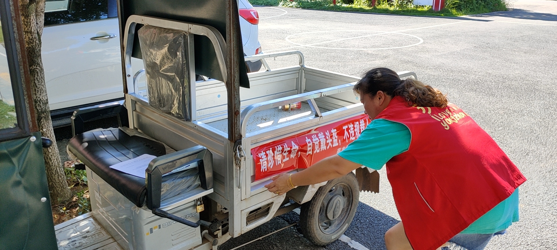 “车车贴”流动宣传。活动中,各村两站两员将警示标语粘贴在三轮车车身两侧或车头车尾,大力宣传三轮车违法载人、不按规定行驶,不系安全带,不正确佩戴安全头盔等交通违法行为可能产生的严重后果,并与驾驶人签订承诺书,要求驾驶人严格遵守交通法规,坚决杜绝三轮车载人情况发生。引导其牢固树立“生命至上,安全第一”的交通意识。