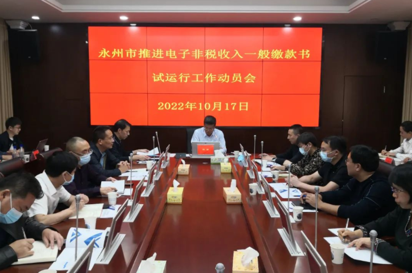 10月17日下午,全市推进电子非税收入一般缴款书试运行工作动员会暨业务培训会在冷水滩区召开。会议由市财政事务中心主任胡钢主持,市财政局党组成员、副局长杨迪出席会议,各县市区财政局、财政事务中心(非税局)及市本级各代理银行、前端厂商等有关负责同志70余人参加会议。