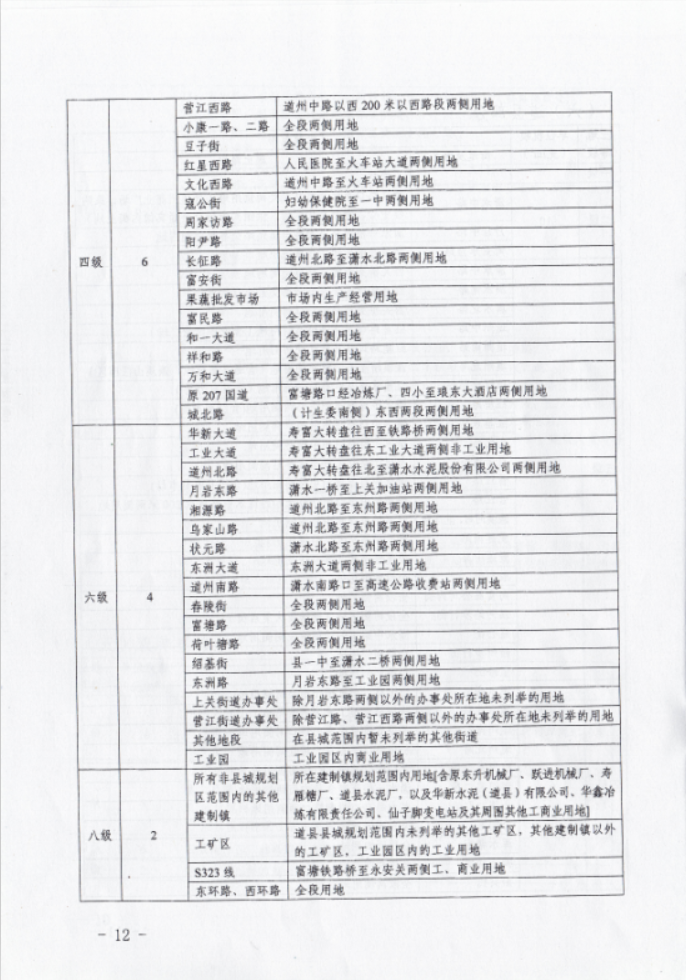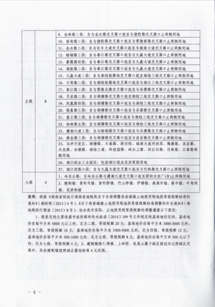 永州市人民政府办公室关于调整各县区城镇土地使用税地段等级税额标准的通知