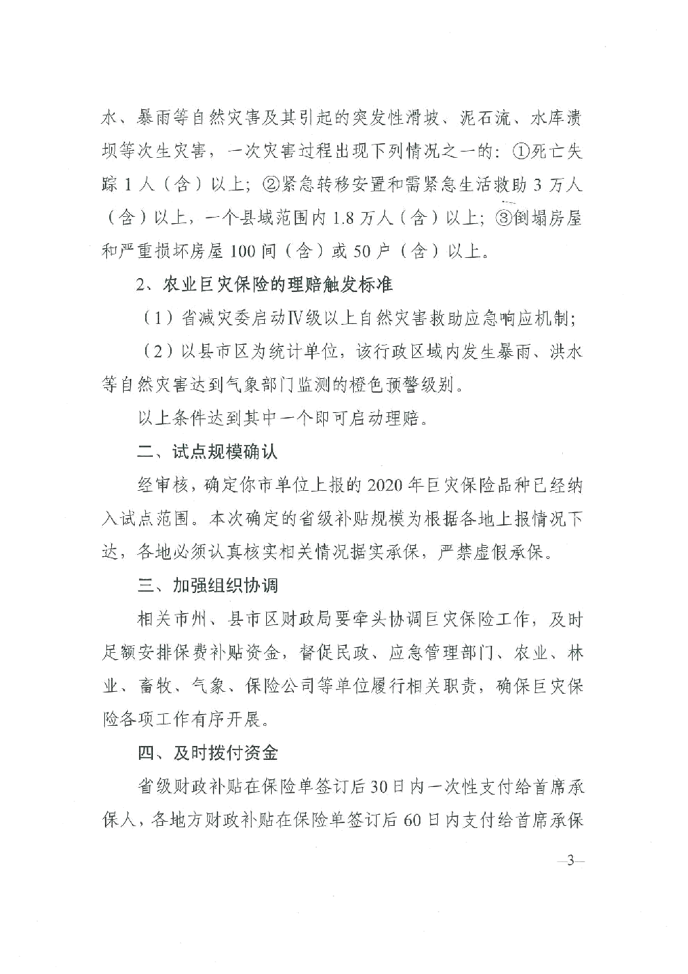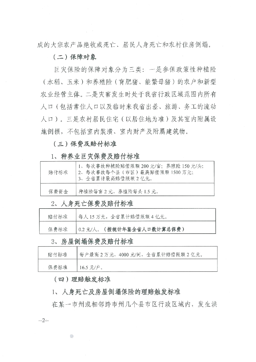 保障范围:巨灾保险的保障范围涵盖我省经常遭受的暴雨、洪水自然灾害及其引起的突发性滑坡、泥石流、水库溃坝等次生灾害造成的大宗农产品绝收或死亡。