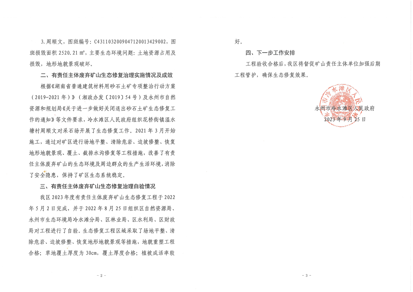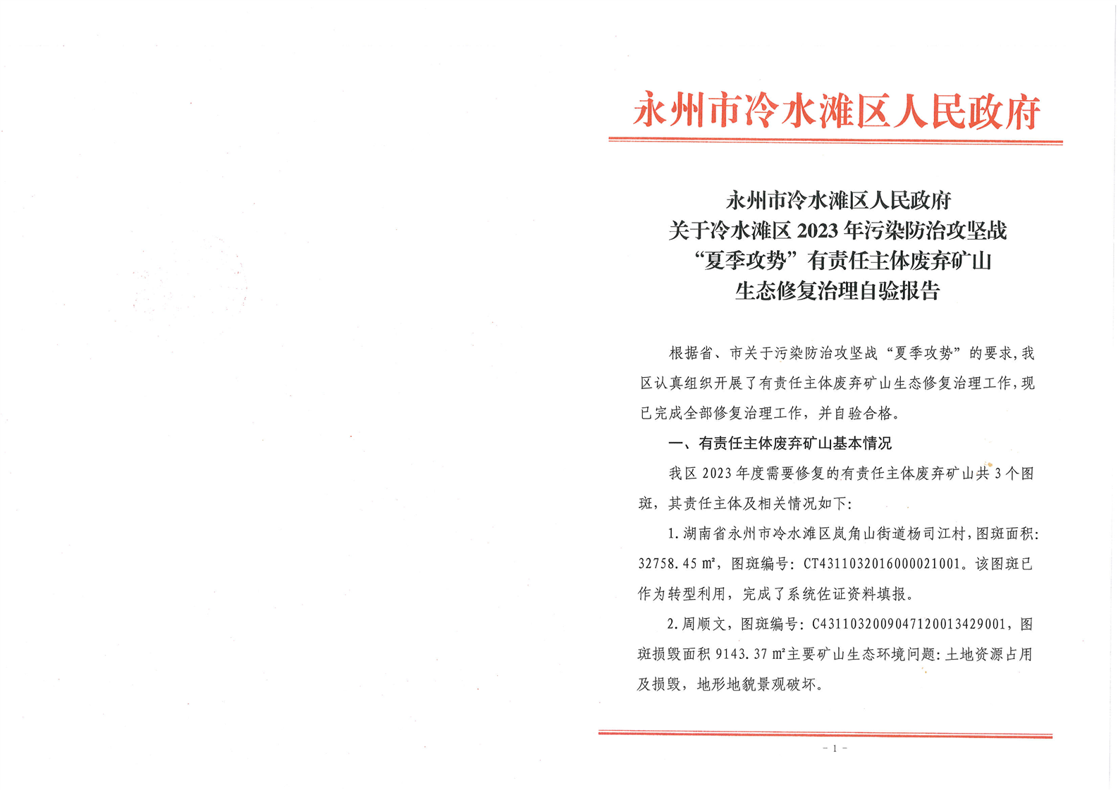 关于冷水滩区2023年污染防治攻坚战“夏季攻势”有责任主体废弃矿山生态修复治理自验报告公示