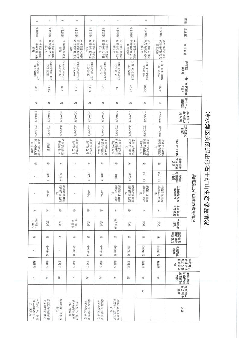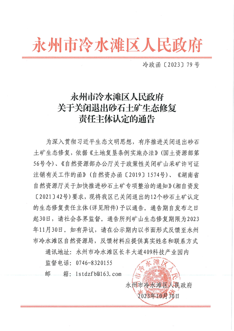 永州市冷水滩区人民政府关于关闭退出砂石土矿生态修复责任主体认定的通知书 (冷政函【2023】79号)