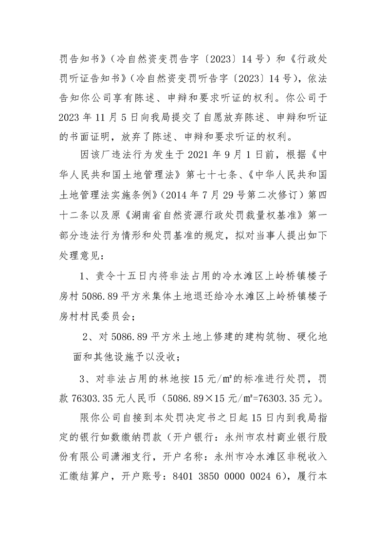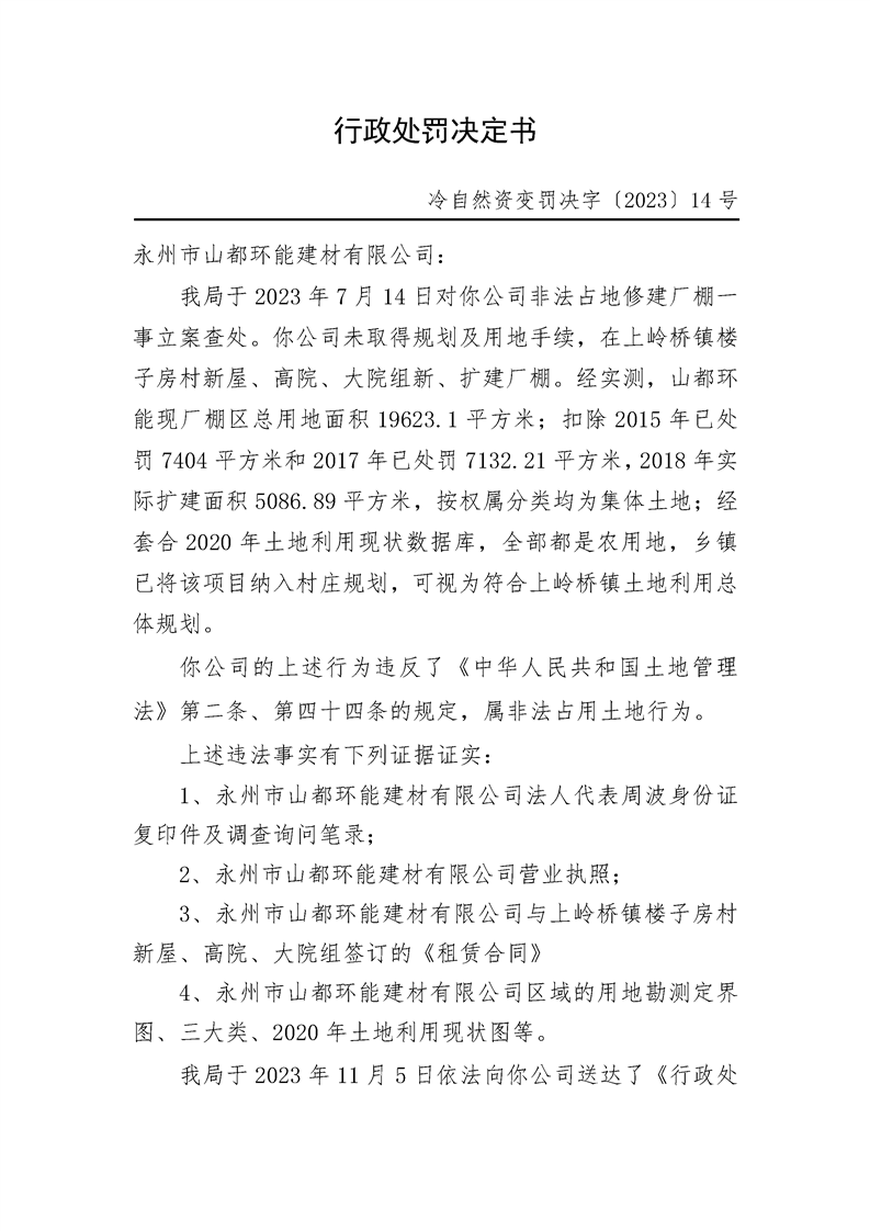 永州市山都环能建材有限公司非法占地修建厂棚行政处罚决定书
