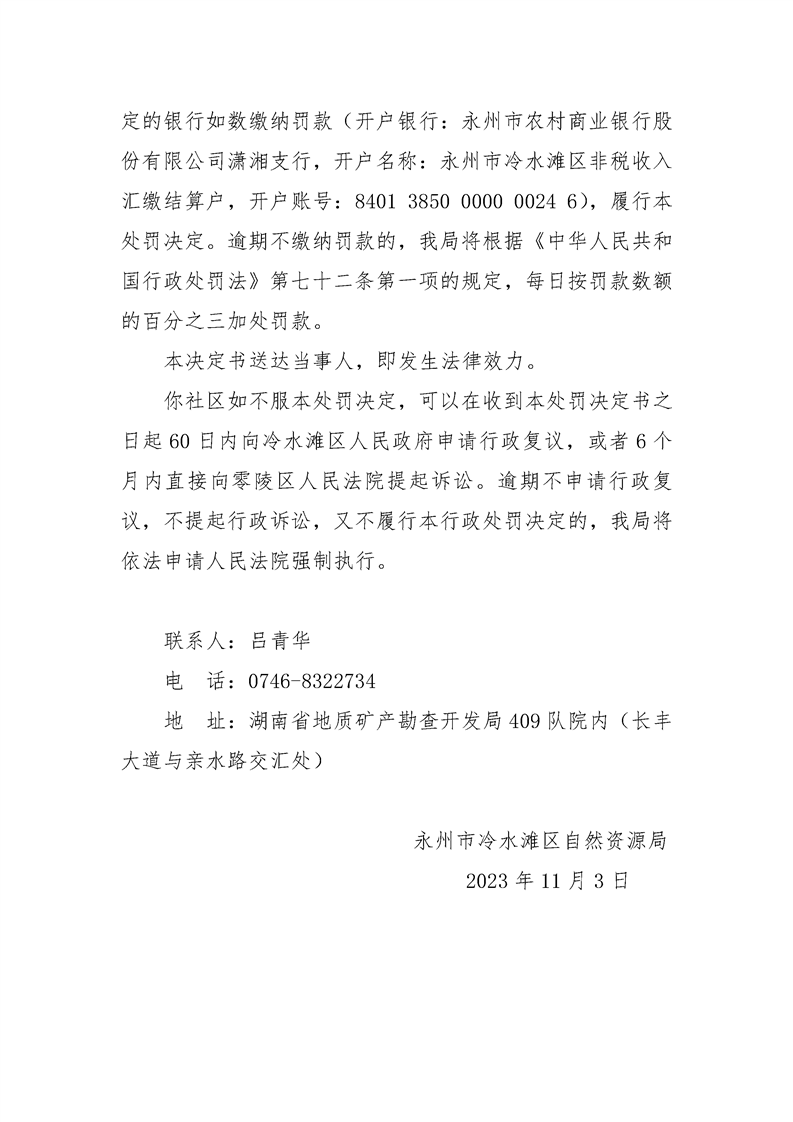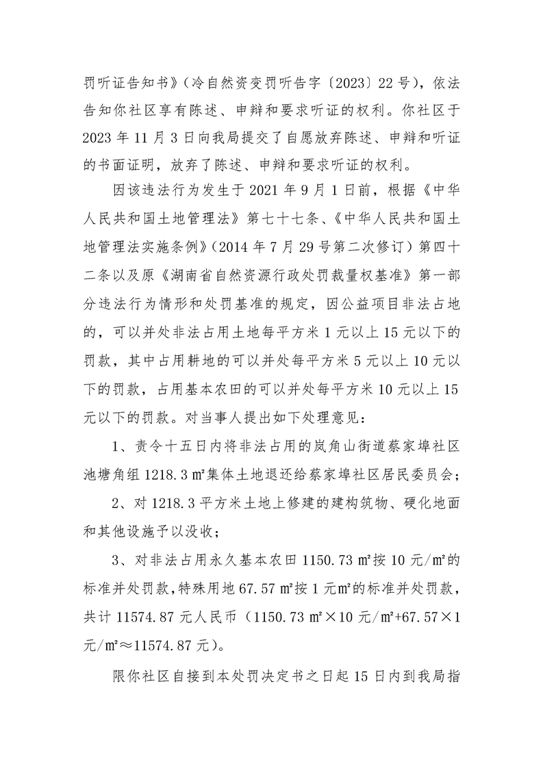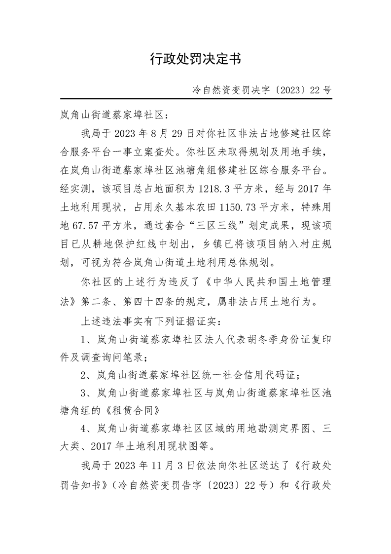 冷水滩区岚角山街道蔡家埠社区非法占地修建社区综合服务平台行政处罚决定书