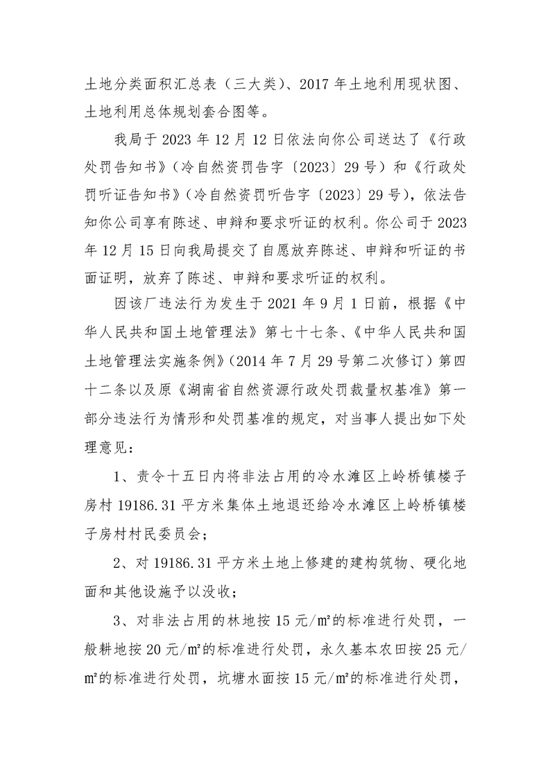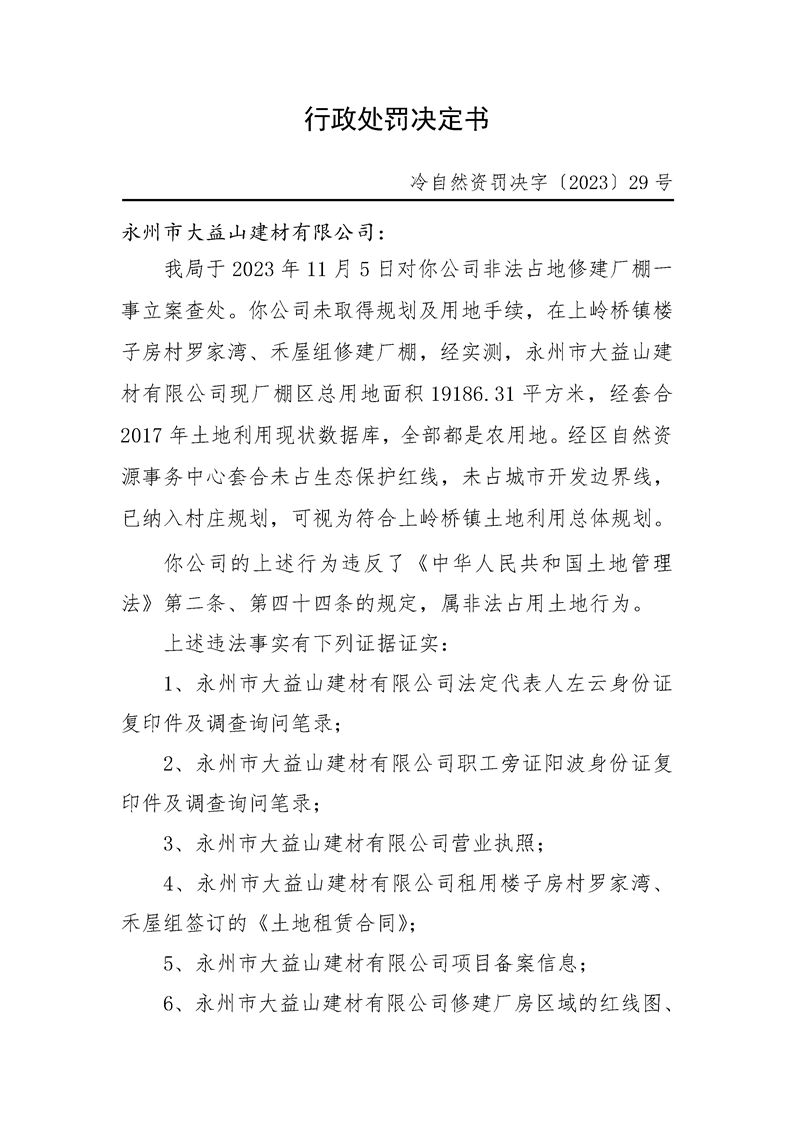 永州市大益山建材有限公司非法占地修建厂棚一事行政处罚决定书
