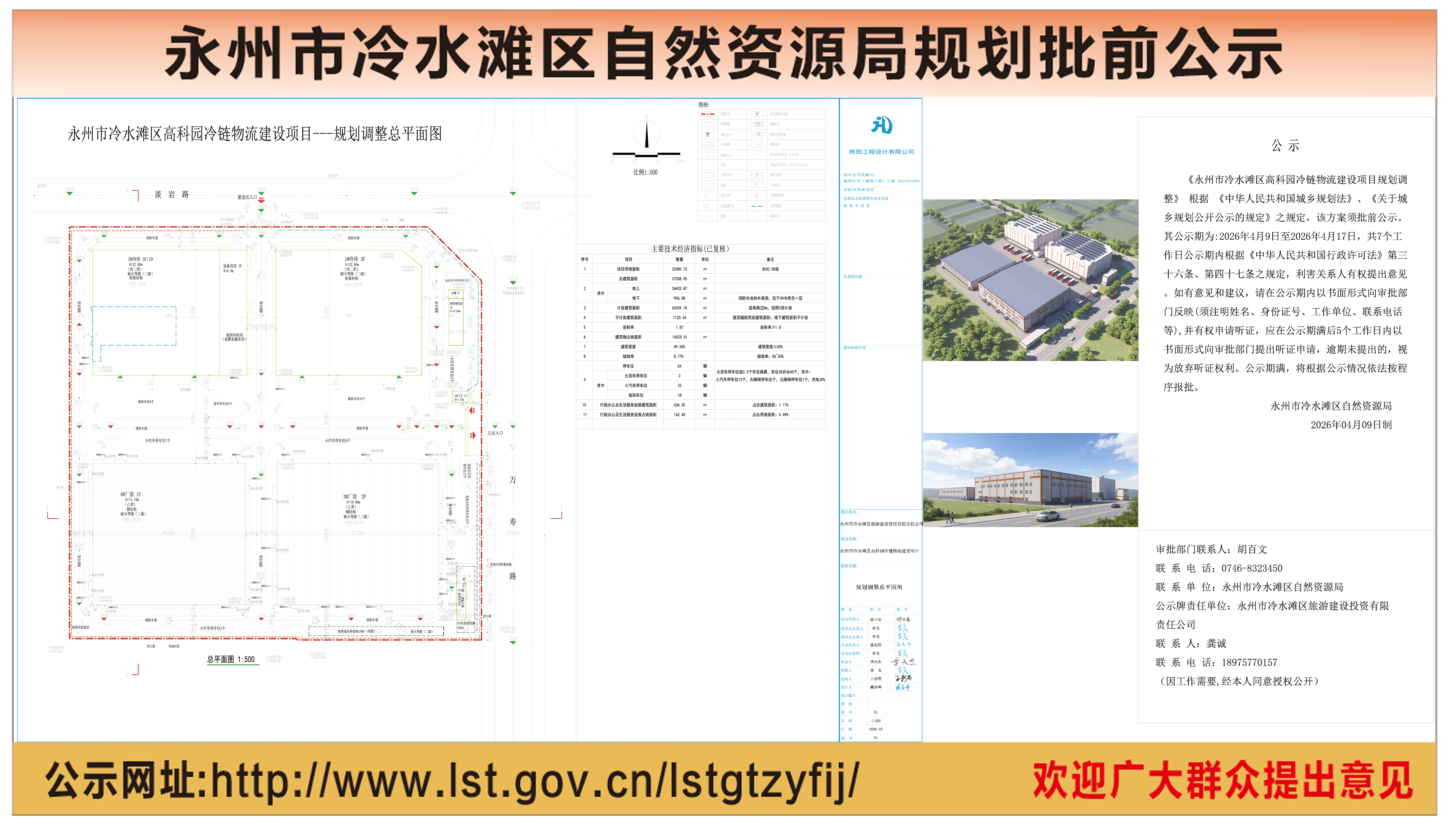 《永州市冷水滩区高科园冷链物流建设项目规划调整》 根据 《中华人民共和国城乡规划法》、《关于城乡规划公开公示的规定》之规定,该方案须批前公示。其公示期为:2026年4月9日至2026年4月17日,共7个工作日公示期内根据《中华人民共和国行政许可法》第三十六条、第四十七条之规定,利害关系人有权提出意见。如有意见和建议,请在公示期内以书面形式向审批部门反映(须注明姓名、身份证号、工作单位、联系电话等),并有权申请听证,应在公示期满后5个工作日内以书面形式向审批部门提出听证申请,逾期未提出的,视为放弃听证权利。公示期满,将根据公示情况依法按程序报批。