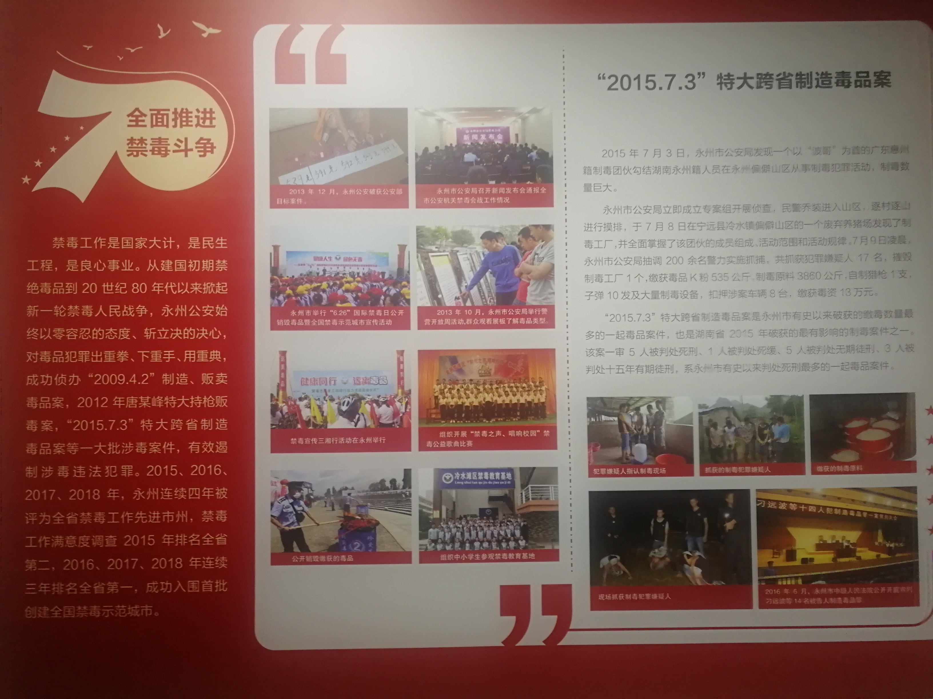 经讲解员讲解,永州连续四年被评为全省禁毒工作先进市州,禁毒工作满意度调查2015年排名全省第二,2016、2017、2018年连续三年排名全省第一,成功入围首批创建全国禁毒示范城市。