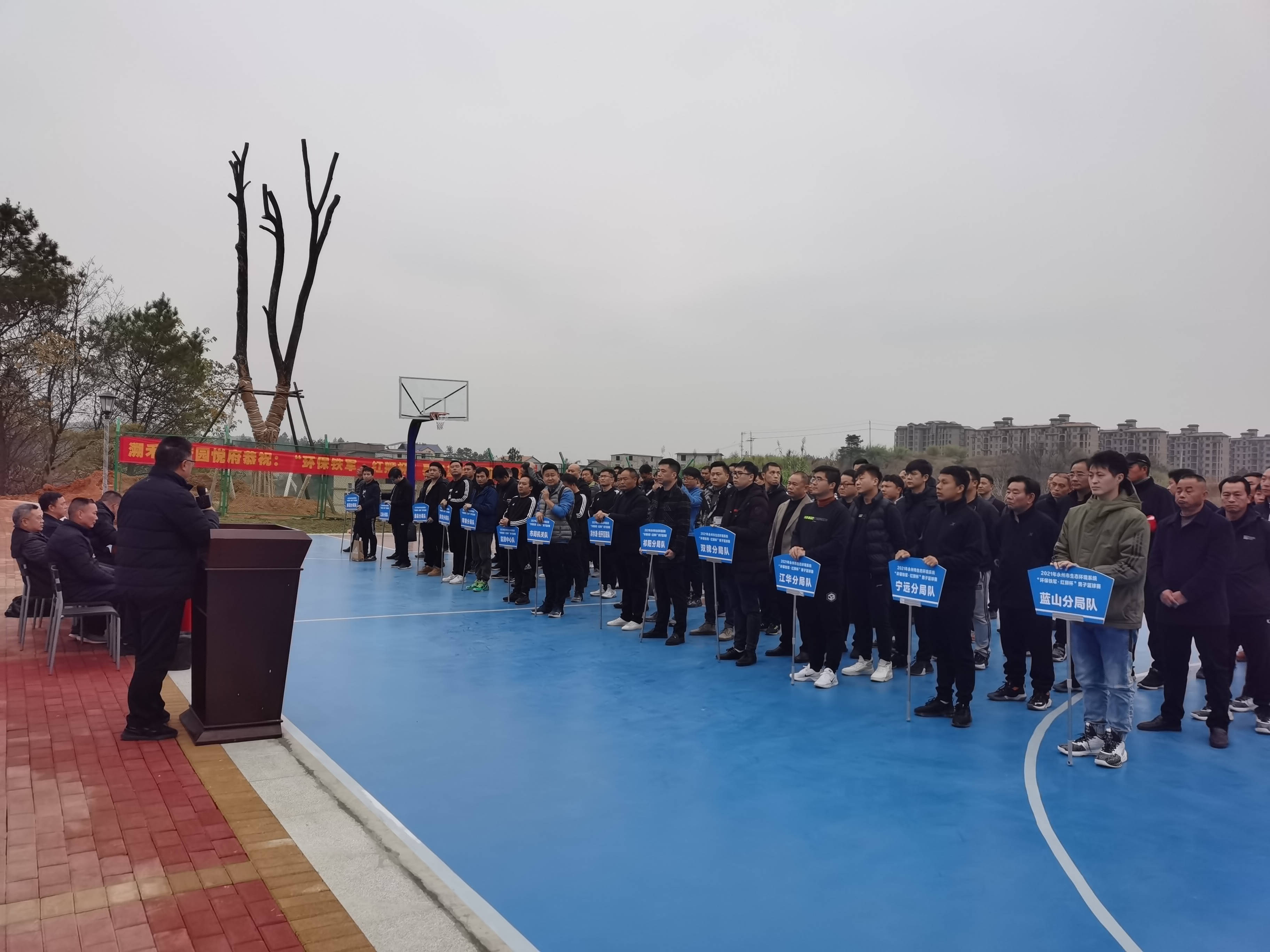 为庆祝中华人民共和国成立72周年,不断丰富全市生态环境系统干部职工业余文化生活,进一步提升全市生态环境系统的凝聚力,2021年12月16日-19日,为期四天的2021年永州生态环境系统“环保铁军•红狮杯”男子篮球赛在永州市生态环境监测执法大楼篮球场隆重开幕。永州市生态环境局冷水滩分局组织队伍积极参加。