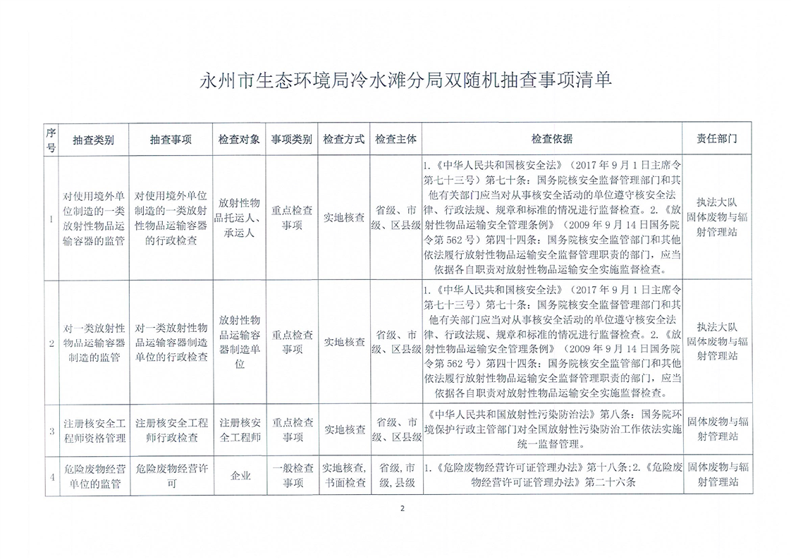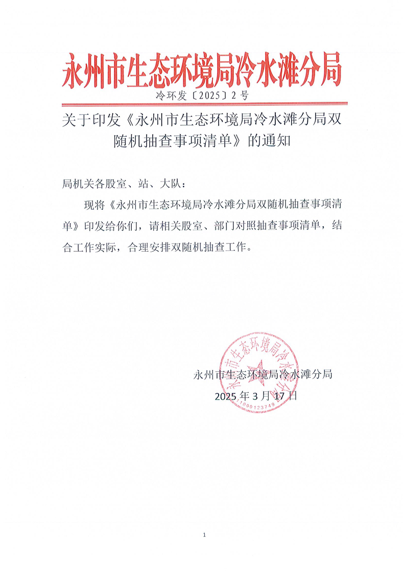 关于印发《永州市生态环境局冷水滩分局分局双随机抽查事项清单》的通知