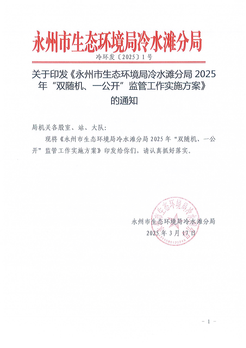 关于印发《永州市生态环境局冷水滩分局2025年“双随机、一公开”监管工作实施方案》的通知
