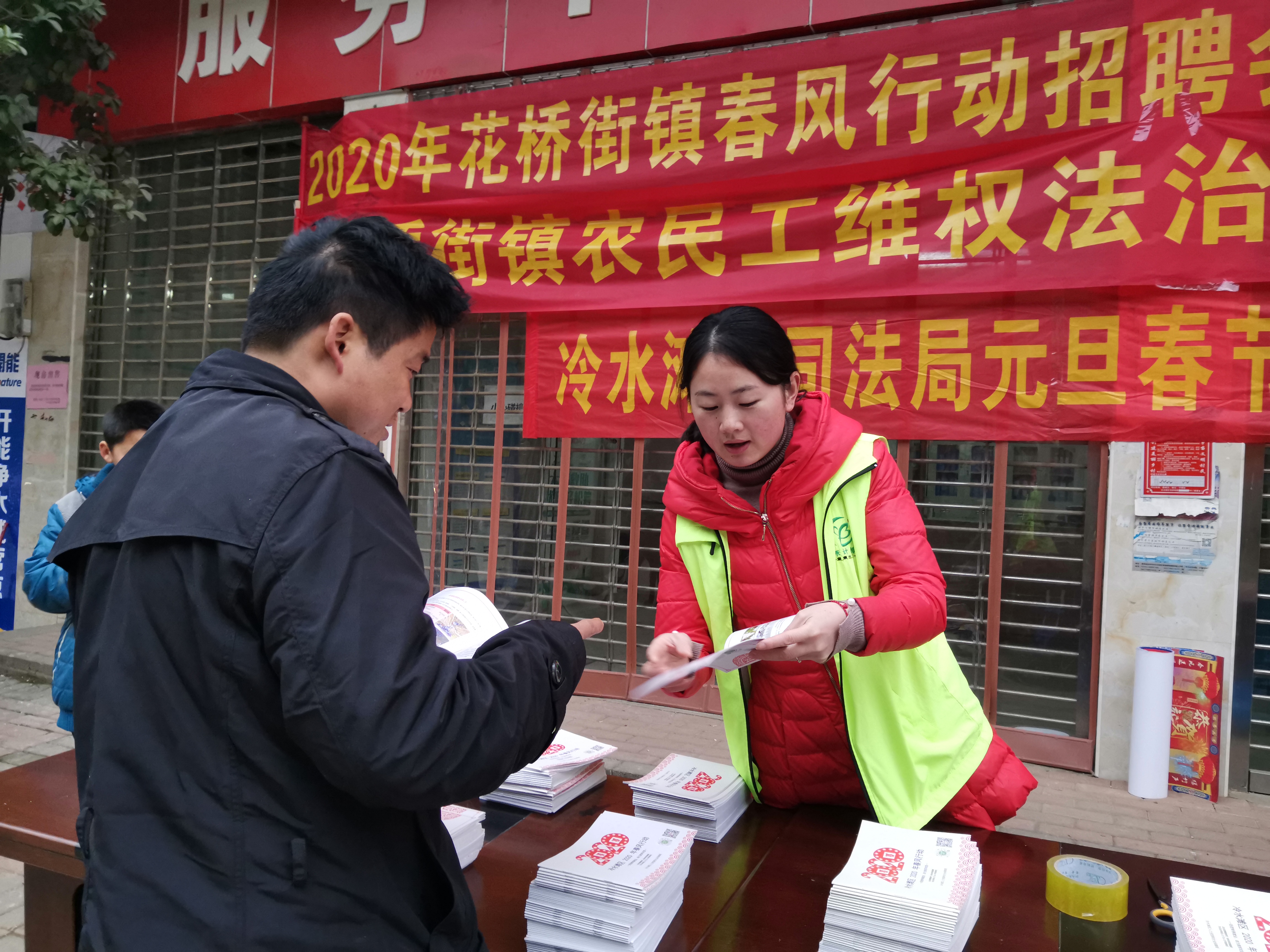 1月20日上午,冷水滩区花桥街镇利用外出务工人员回家过年之机,在该镇集市开展2020年春风行动暨“促进转移就业、助力脱贫攻坚”大型系列招聘和农民工维权法治宣传活动。