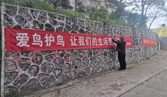 巡逻期间工作人员在村社区各个路段发放了宣传资料,张贴横幅标语,开展护鸟知识宣传,就候鸟迁徙规律,习性等相关知识向村民进行详细地讲解,要求村民签订野生动物保护责任书,并重点检查林区是否有非法捕鸟行为。