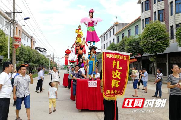 6月11日,在黄阳司镇人民政府广场,观音送子、财神到、西游记、刘海砍樵4台“扎故事”上街预演,吸引周边群众热情围观;在黄阳司湘江河段,14支龙舟队在江面穿梭,雄壮的号子声、船头激越的鼓点,伴随着岸边的加油声、呐喊声,格外热闹。工作人员介绍,6月18日,将有8台“扎故事”上街巡游,还有舞龙、舞狮、彩船、艄公、乌龟精、蚌壳精、踩高跷等民俗表演,规模超过以往。