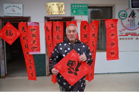 图为五峰岭村民与写好的“福”字拍照留念