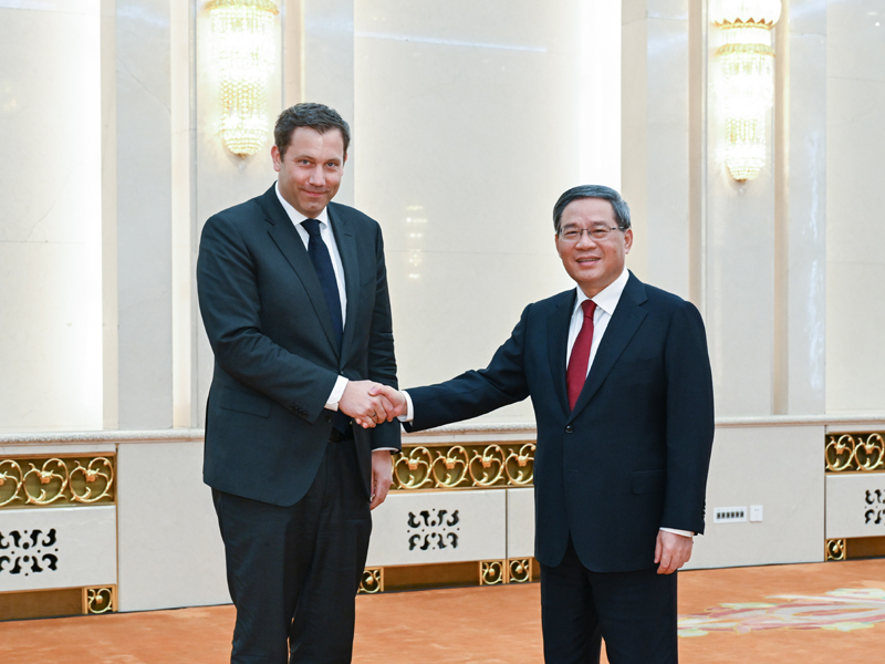 6月5日下午,中共中央政治局常委、国务院总理李强在北京人民大会堂会见由德国社会民主党联合主席克林贝尔率领的代表团。新华社记者 张领 摄