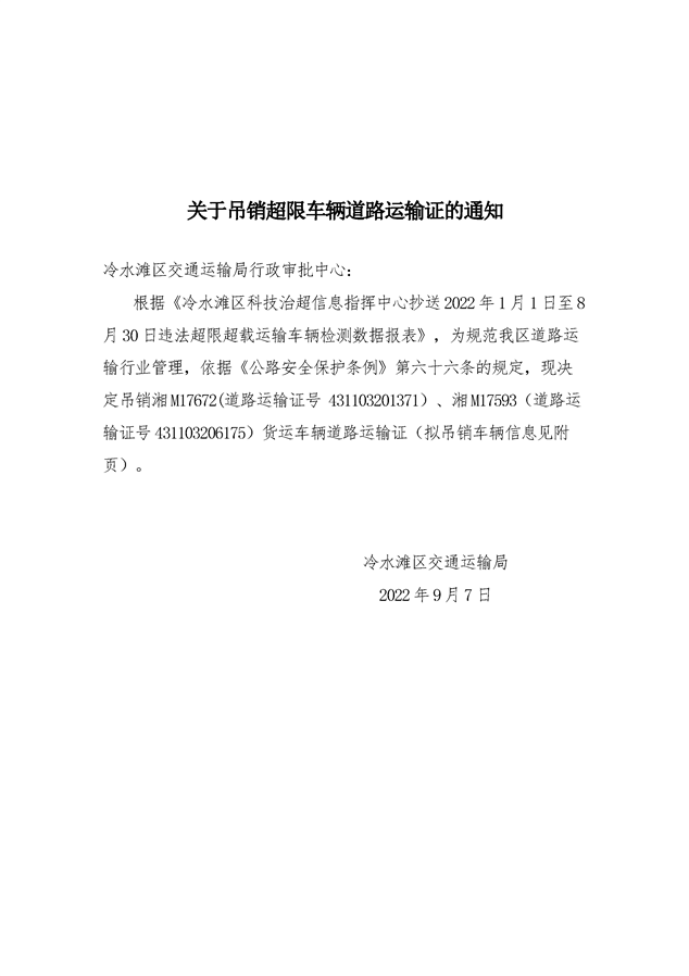关于吊销超限车辆道路运输证的公告