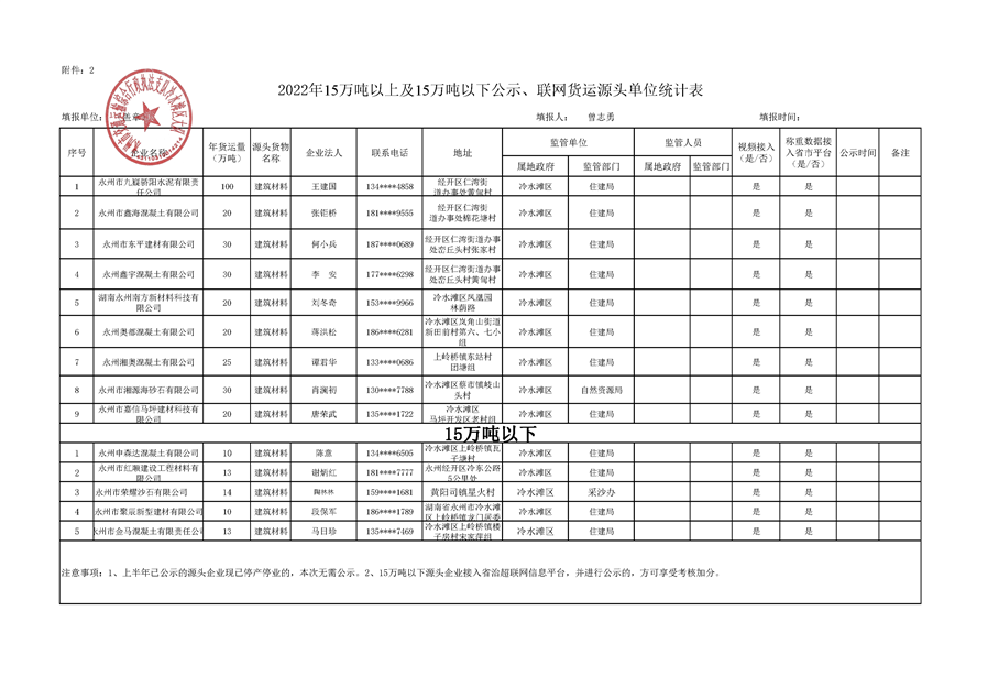 2022年15万吨货运源头企业统计公示表