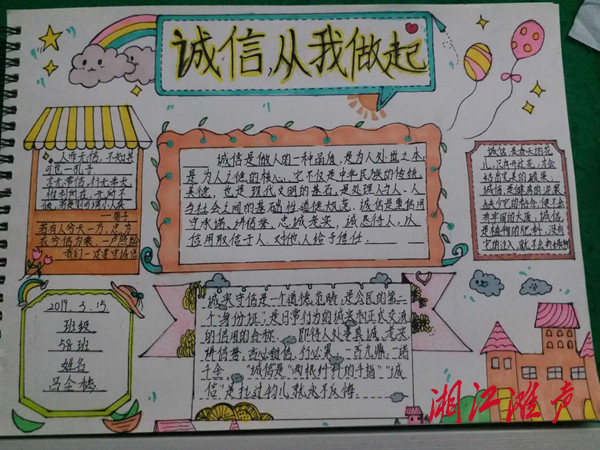 “诚信是社会生活中必不可少的思想品德,只有诚信的人才能建立良好的关系,才能交到好朋友。”来自高峰学校1911班的杨凤同学在手抄报上写上了自己对诚信的理解。