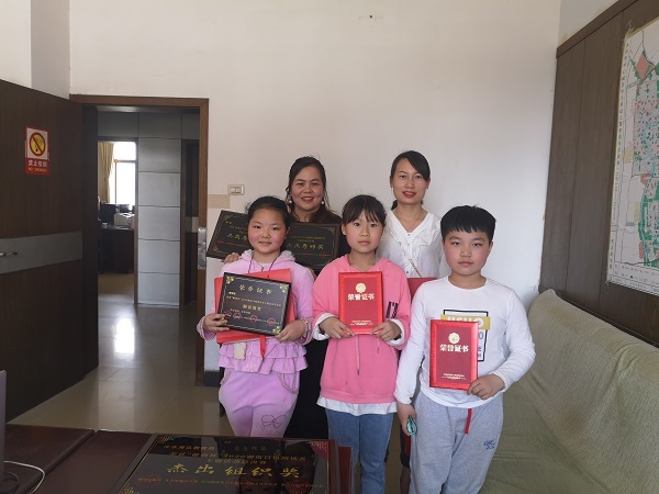 颁奖现场,来自永州市冷水滩区翠竹园小学的老师周姣、周艳飞获得了“杰出导师奖”奖章,该校学生艾艺萱、周煜然获“优胜奖”荣誉证书,5名师生拿到证书后开心地合影留念,期待着下次比赛再展风采。