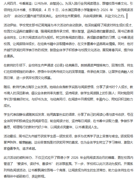 书香四月天・阅读启新程——冷水滩区舜德小学2026年全民阅读活动月启动仪式暨齐越节颁奖典礼圆满举行