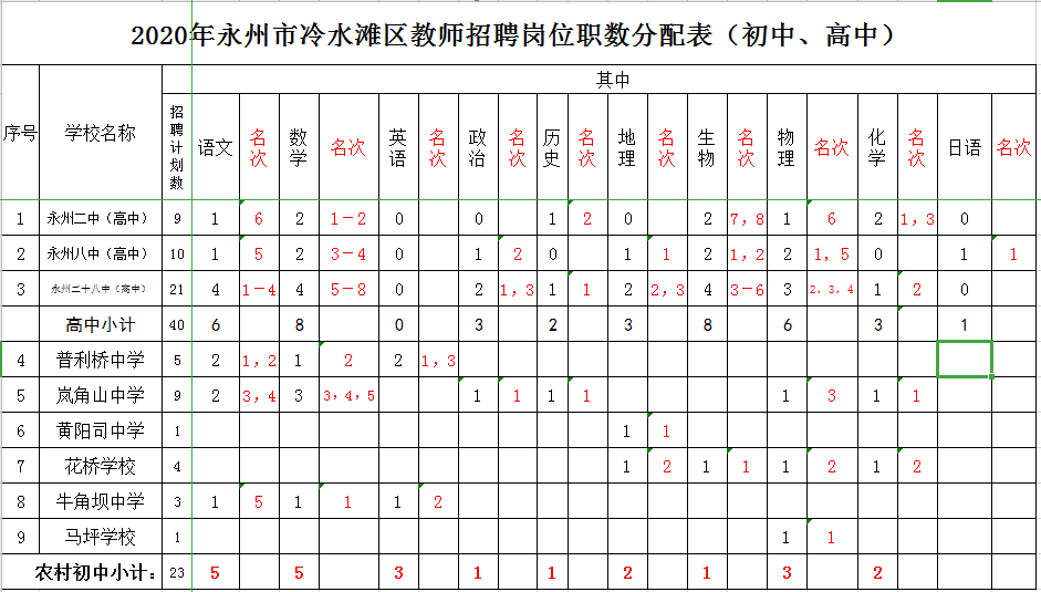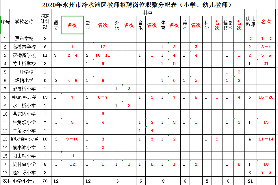 2020年永州市冷水滩区教师招聘岗位设置表