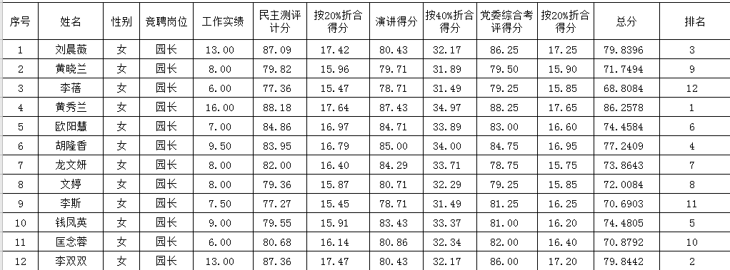 根据《冷水滩区部分公办幼儿园园长竞聘上岗工作实施方案》,现将2020年冷水滩区公办幼儿园园长竞聘上岗综合成绩予以公示,公示期:2020年8月17日至2020年8月21日,共5个工作日,公示期内如有异议,请与冷水滩区教育局联系。