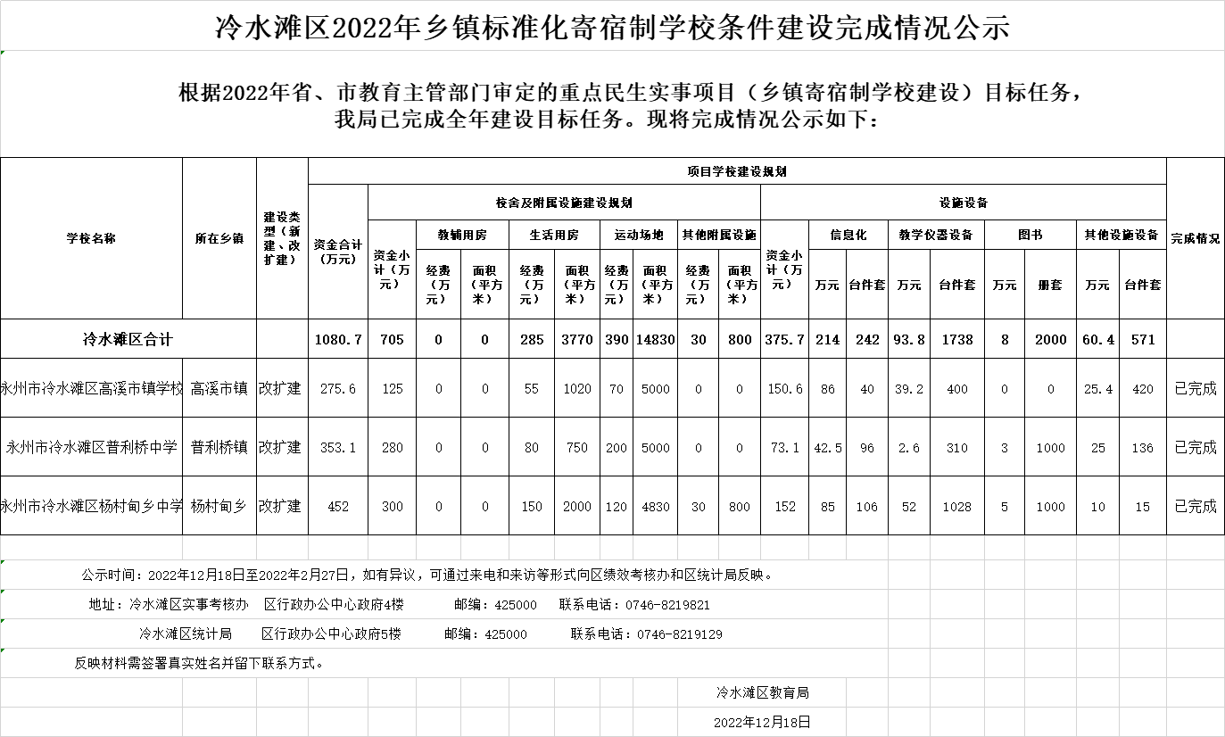 冷水滩区2022年乡镇标准化寄宿制学校条件建设完成情况公示