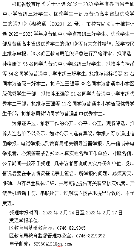 2022-2023学年度冷水滩区普通中小学省市区级三好学生、优秀学生干部及普通高中省级优秀学生评选、推荐结果公示名单
