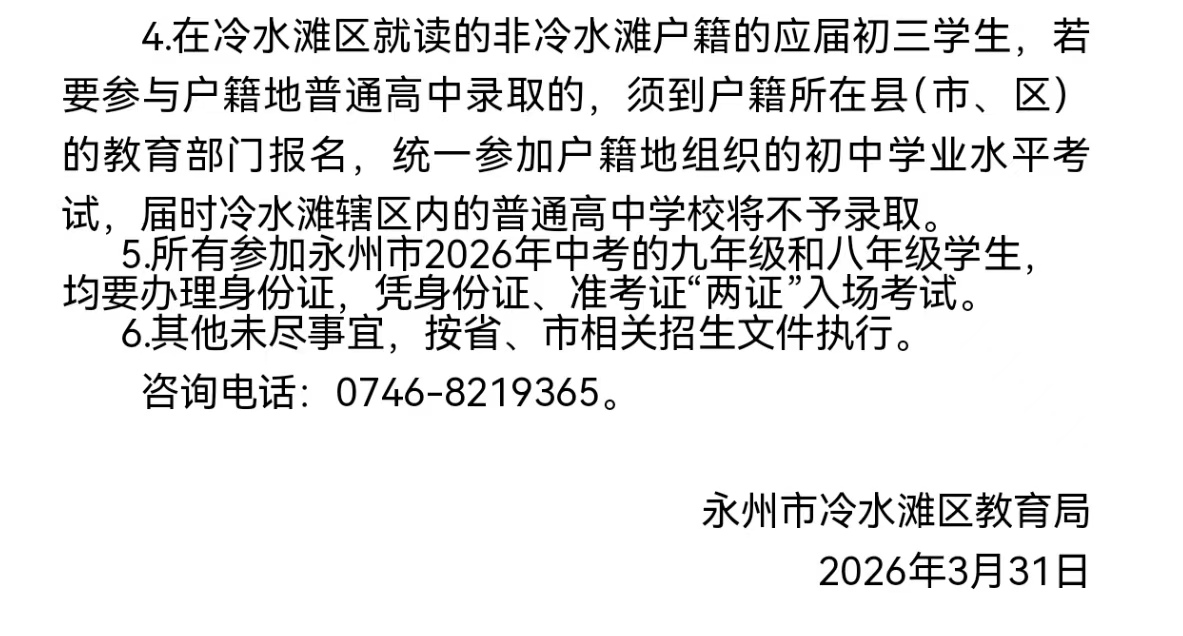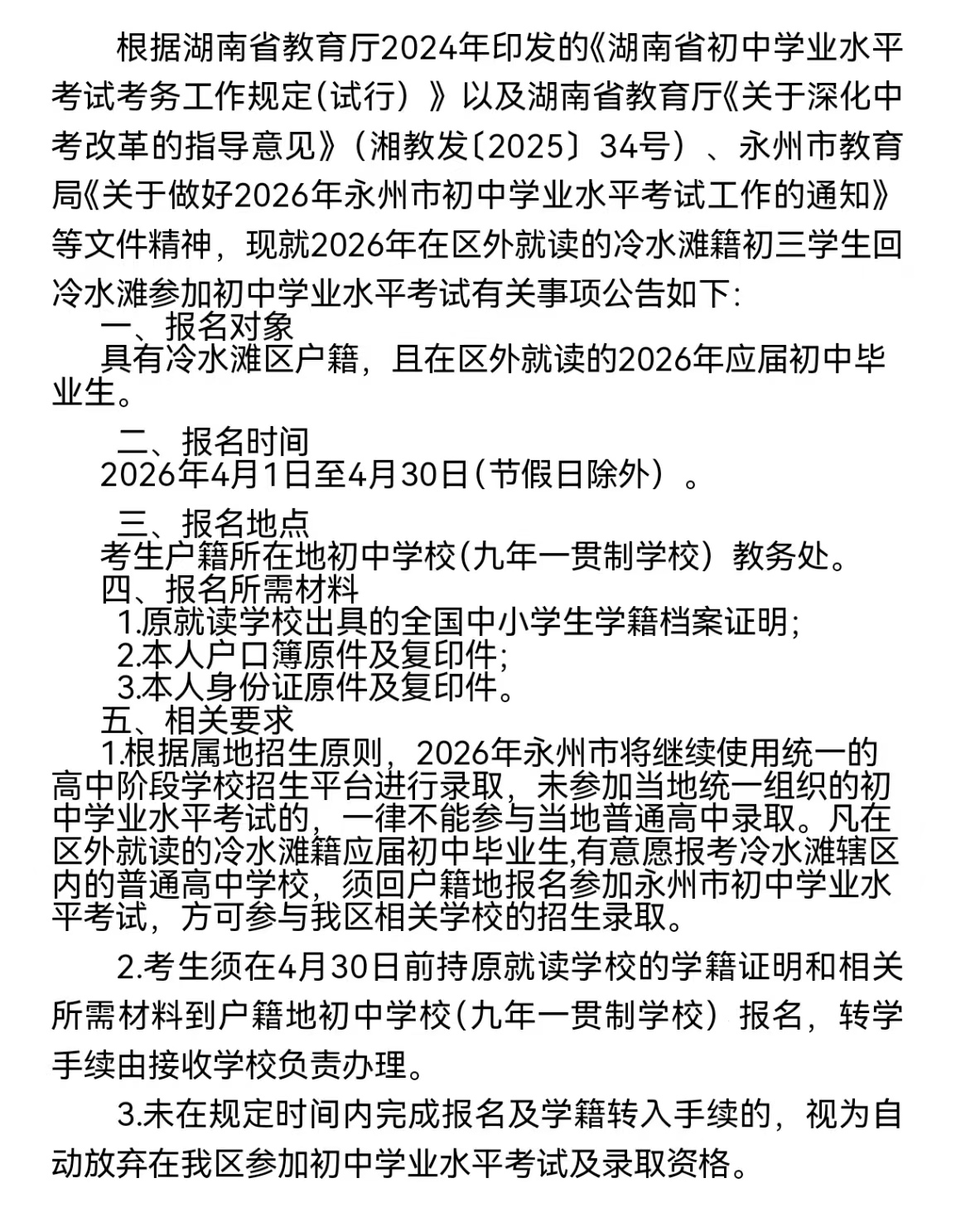 关于2026年在区外就读的冷水滩籍应届初三学生回冷水滩参加中考事项的公告