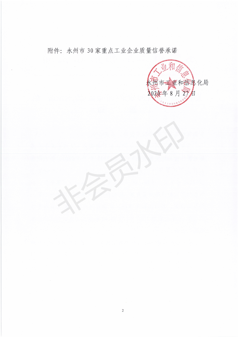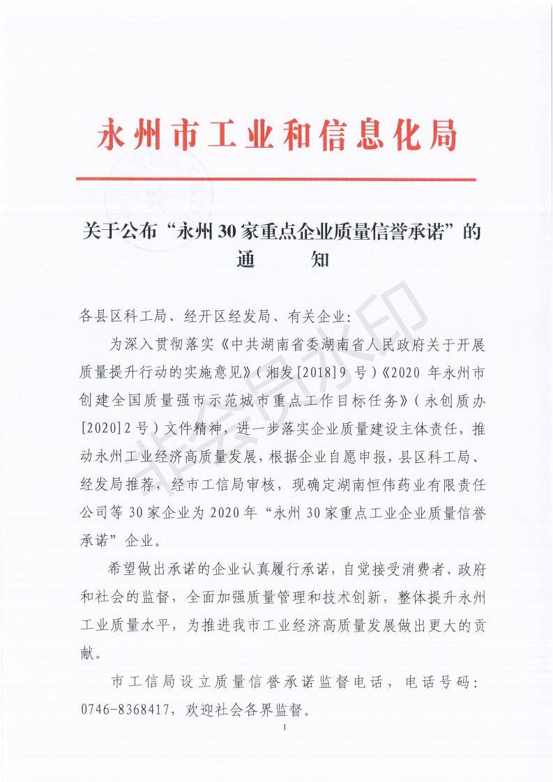 为深入贯彻落实《中共湖南省委湖南省人民政府关于开展质量提升行动的实施意见》(湘发[2018]9号)《2020年永州市创建全国质量强市示范城市重点工作目标任务》(永创质办[2020]2号)文件精神,进一步落实企业质量建设主体责任,推动永州工业经济高质量发展,根据企业自愿申报,县区科工局、经发局推荐,经市工信局审核,现确定湖南恒伟药业有限责任公司等30家企业为2020年“永州30家重点工业企业质量信誉承诺”企业。