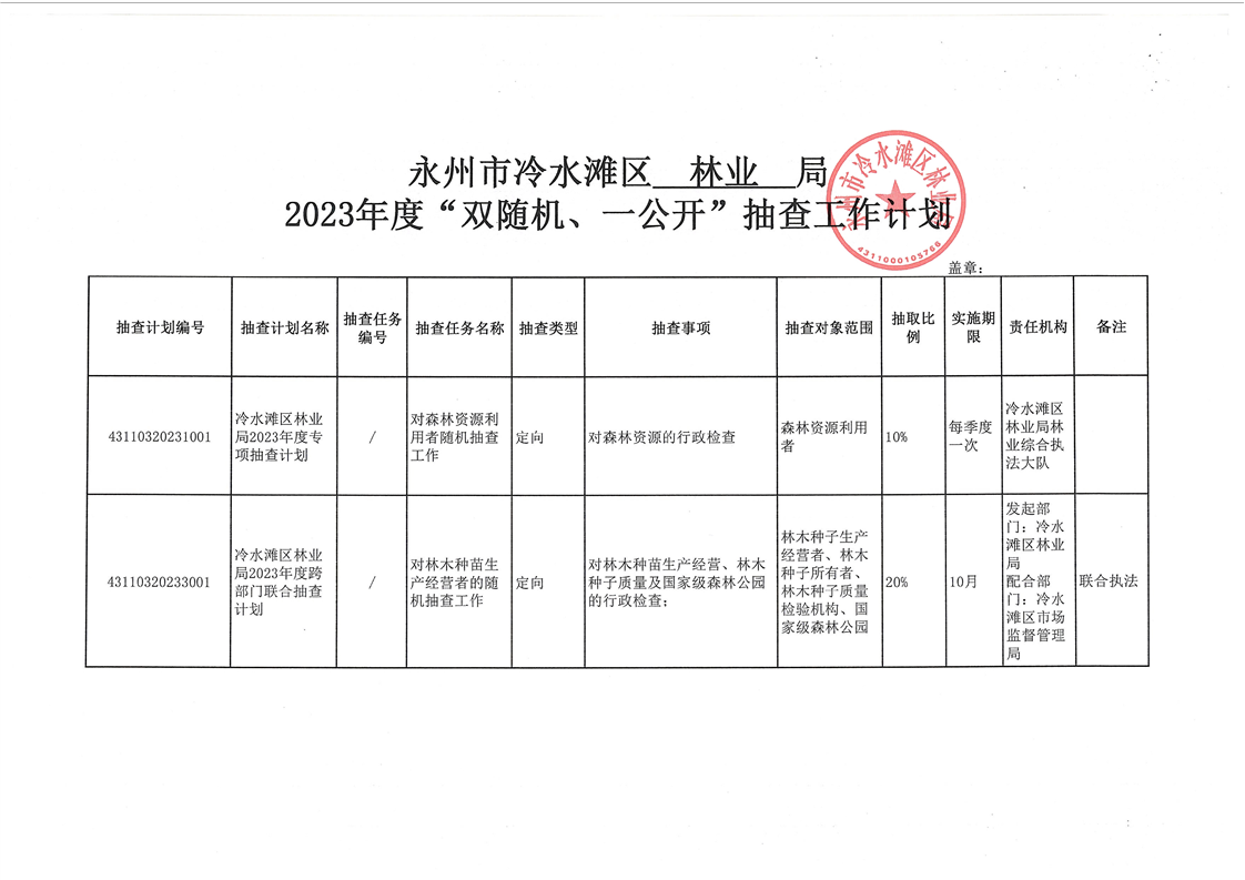 永州市冷水滩区林业局2023年度“双随机、一公开”抽查工作计划