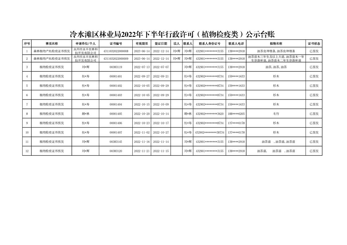 冷水滩区林业局2022年下半年行政许可(植物检疫类)公示台账