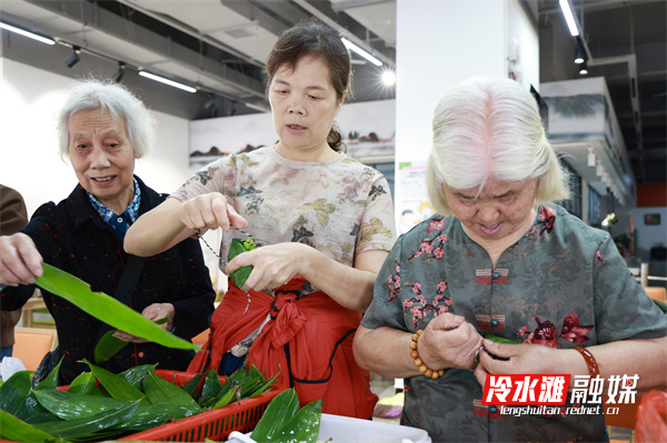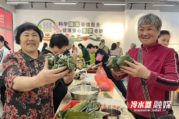 活动现场,志愿者组织老人们一起包粽子,粽叶、糯米、五花肉、红枣等材料整齐摆放,大家折粽叶、填糯米、放馅料、封口、扎捆,手法娴熟,一只只饱满紧实的粽子很快摆满了桌面,现场欢声笑语不断。
