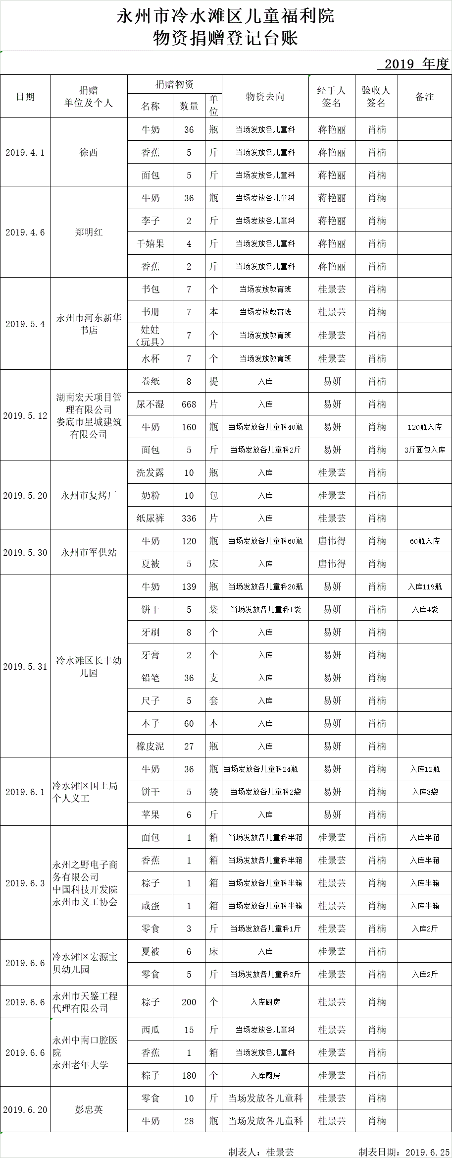 永州市冷水滩区儿童福利院物资捐赠登记台账